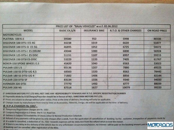 Regulars here might remember that we reported that Mr.Rajiv Bajaj had commented that the bike will be priced below INR 1 lahk. Well, he kept his words but the result is as we expected it to be. True to our fears, the bike has been priced only marginally lower than the 1 lakh figure. The On road price of the ‘all new Bajaj Pulsar 200 NS’ at Mumbai is INR 99,220. The bookings for the much hyped and eagerly awaited bike are now open and the booking amount is Rs.10,000. The fine print condition here is that INR 1000 will be deducted in case of cancelation of booking. The source here is the Bajaj KTM Mumbai dealer which has the bike at its premises and this where our friend Mr.Deepak Dongre spent some time with the new bike. The showroom guys are stating a delivery time of 3 weeks. Going by the hype and hopes this bike has created, we believe that the waiting period might soon shoot up and aim for the moon.