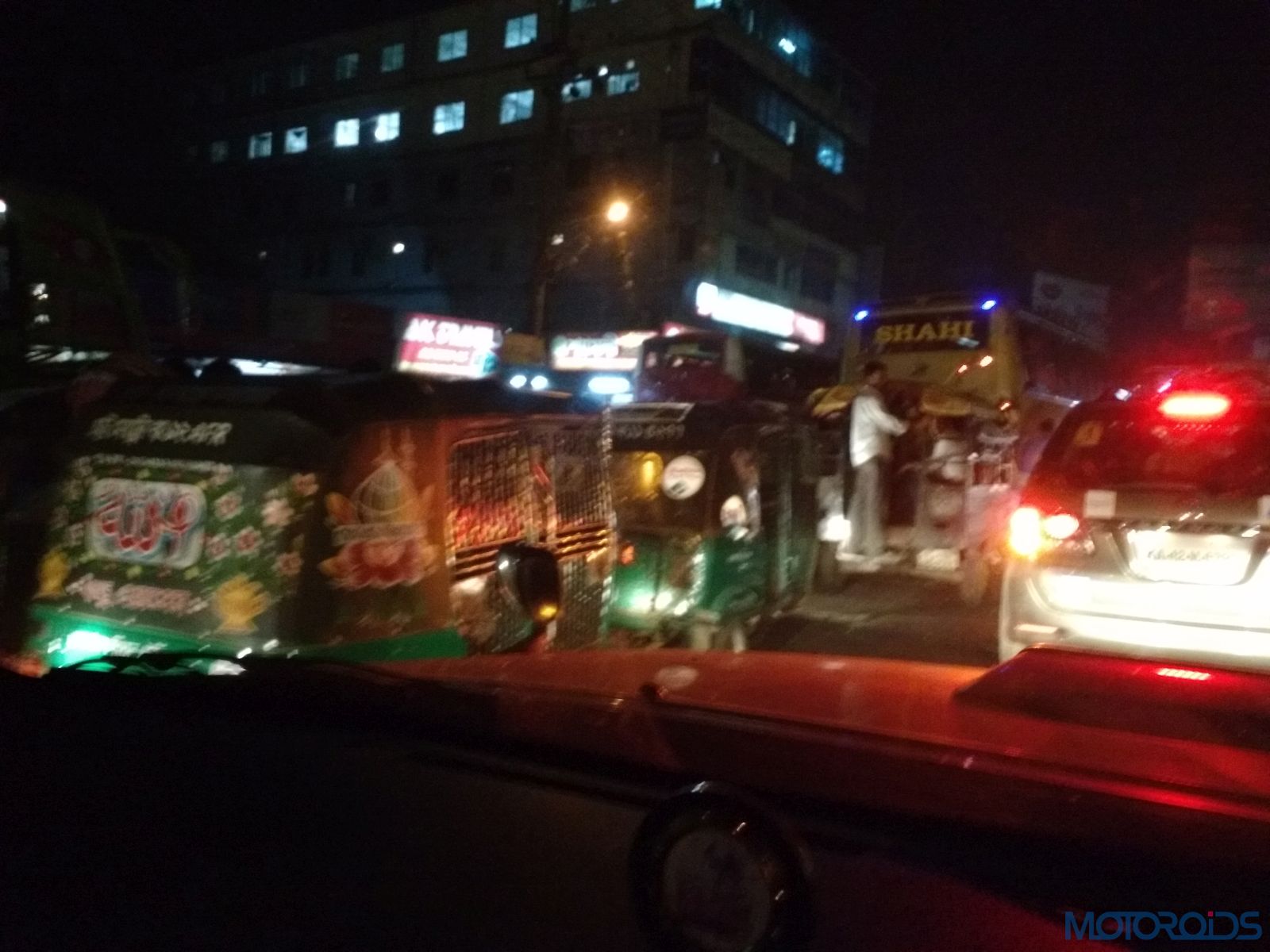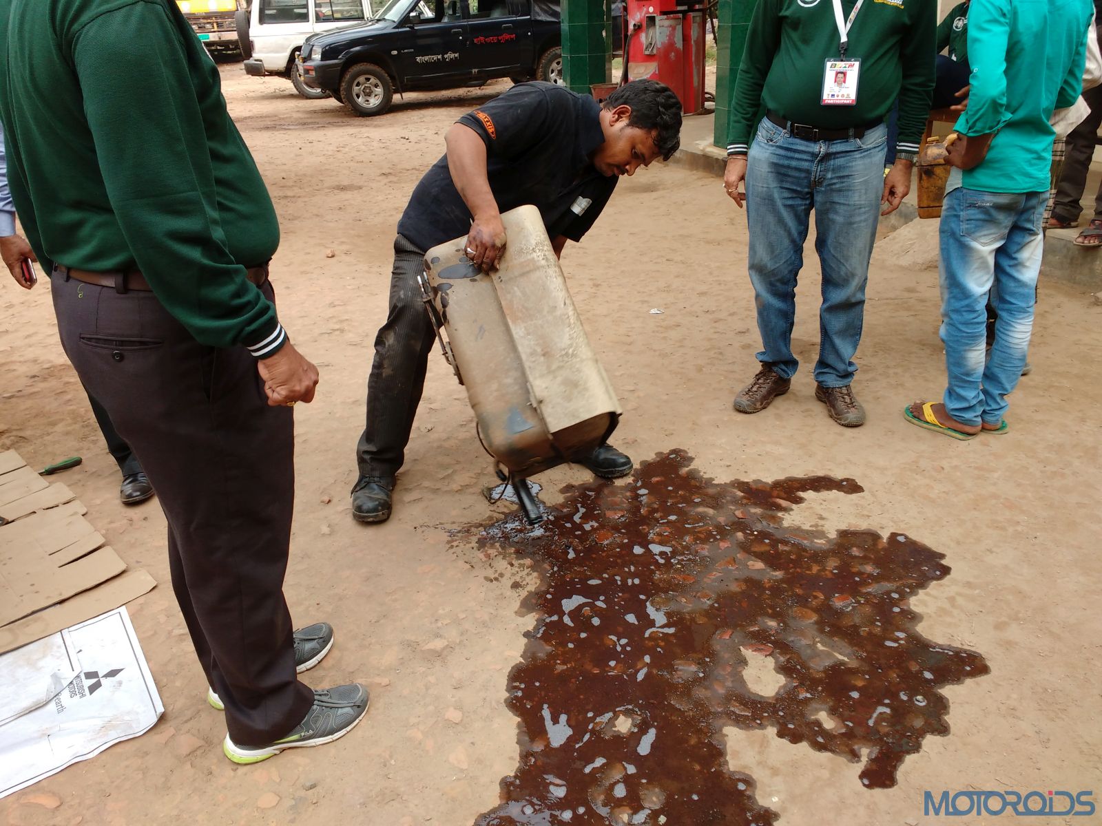 The Mahindra and Toyota backup team then quickly got to work, jacking up the cars and removing the tank to drain them completely. Since we required more hands, local mechanics joined us to help. But then that wasn’t it. While we waited for the tanks to be cleaned, some of us were resting in an electric auto rickshaw, which has a really narrow footprint. Excited to know what it feels like to be driven in one, we asked to driver to take us for a joy ride.