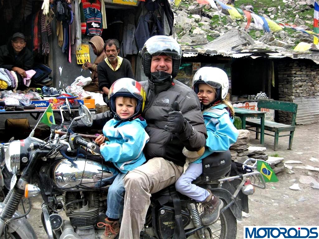Rolling out of Keylong, we have the first landslide, and it took nearly 2 hours off our day. Later the heavens opened up drizzling down making the Keylong-Kaza road an ice-skating ring. But all excited and eager to make it to Kaza no matter what, just like this gentleman exploring the north with his kids.