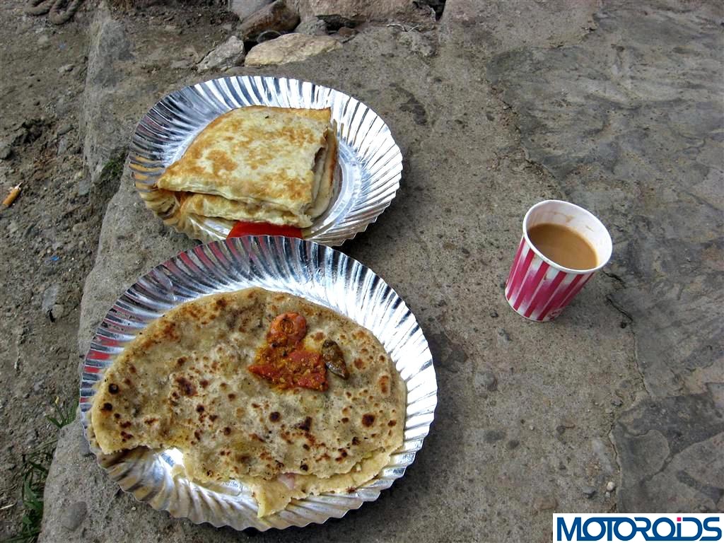 Generously blessed with slush, there was no scope of halting either- thanks to the traffic. Carefully negotiating the non-barricaded twisties I was down the pass in near-starving mode. Luckily found a small roadside eatery and gobbled up two sandwiches and a paratha….relief!