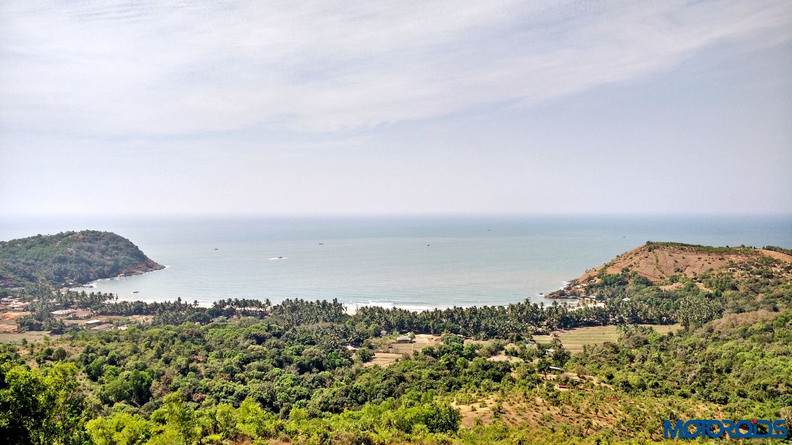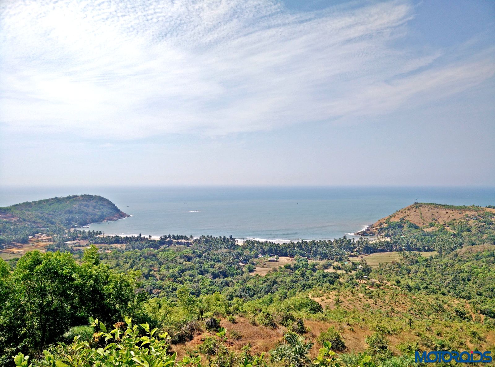 A panoramic view of a beautiful beach nestled between hills en route Om Beach – the most popular of all the beaches in Gokarna