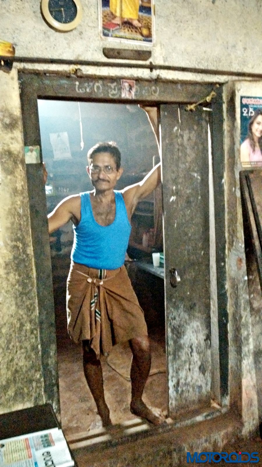 The owner of the toddy bar strikes a pose against his den’s entrance