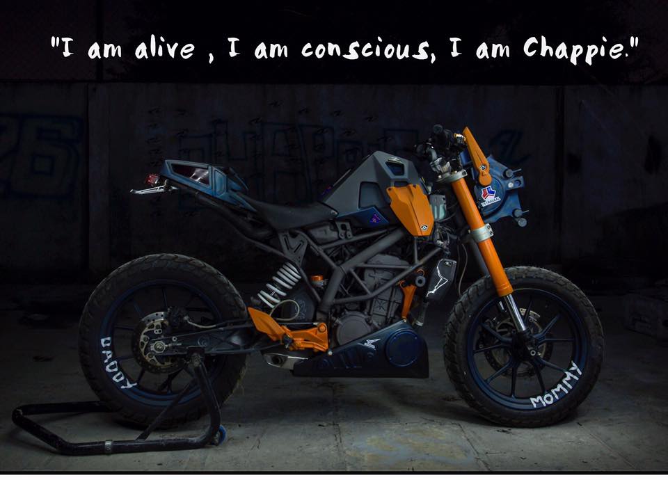 Just before being scrapped, it is given a new lease of life by the squadron’s AI developer (Dev Patel) who infuses a different, stronger AI into the robot, thus giving birth to Chappie. Back in Pune, India, Chappie has gone ahead and inspired its own motorcycle, a customised KTM Duke built by Autologue Design.