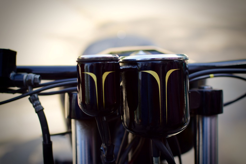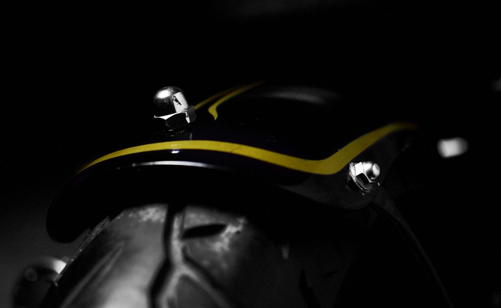 The battery box has a metal base with a leather covering to keep it in place. The minimalist fenders hug the tires, while the ignition key has been done away with. Instead, the wiring was modified and a 3.5mm jack extender masquerades as the key. Most of the electrical parts & accessories are stock but kick pedal, gear shift lever and both the foot rests have been fabricated in house.