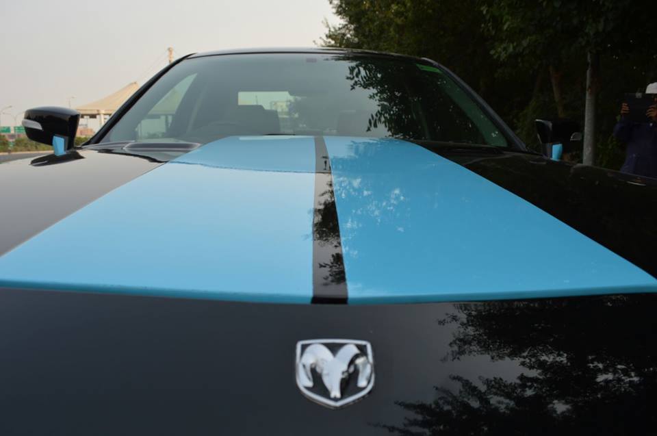 The interiors have been left alone, apart from the misleading Dodge logo on the steering wheel. Also, the rear doors are permanently fixed, as the replica’s two-door appearance is merely built on the Mondeo’s existing bodywork. In the image below, one can see the thick, make-shift C-pillars of the replica running across the Mondeo’s rear windows. The paint scheme here is a fitting gloss black with light blue racing stripes and highlights.