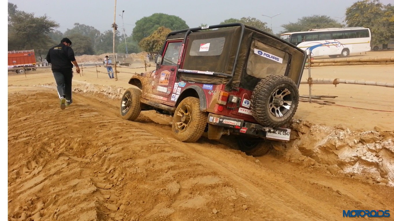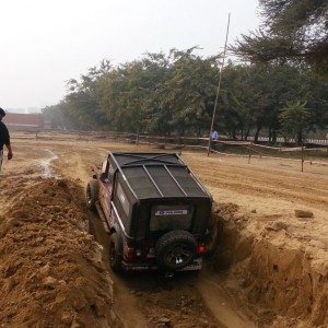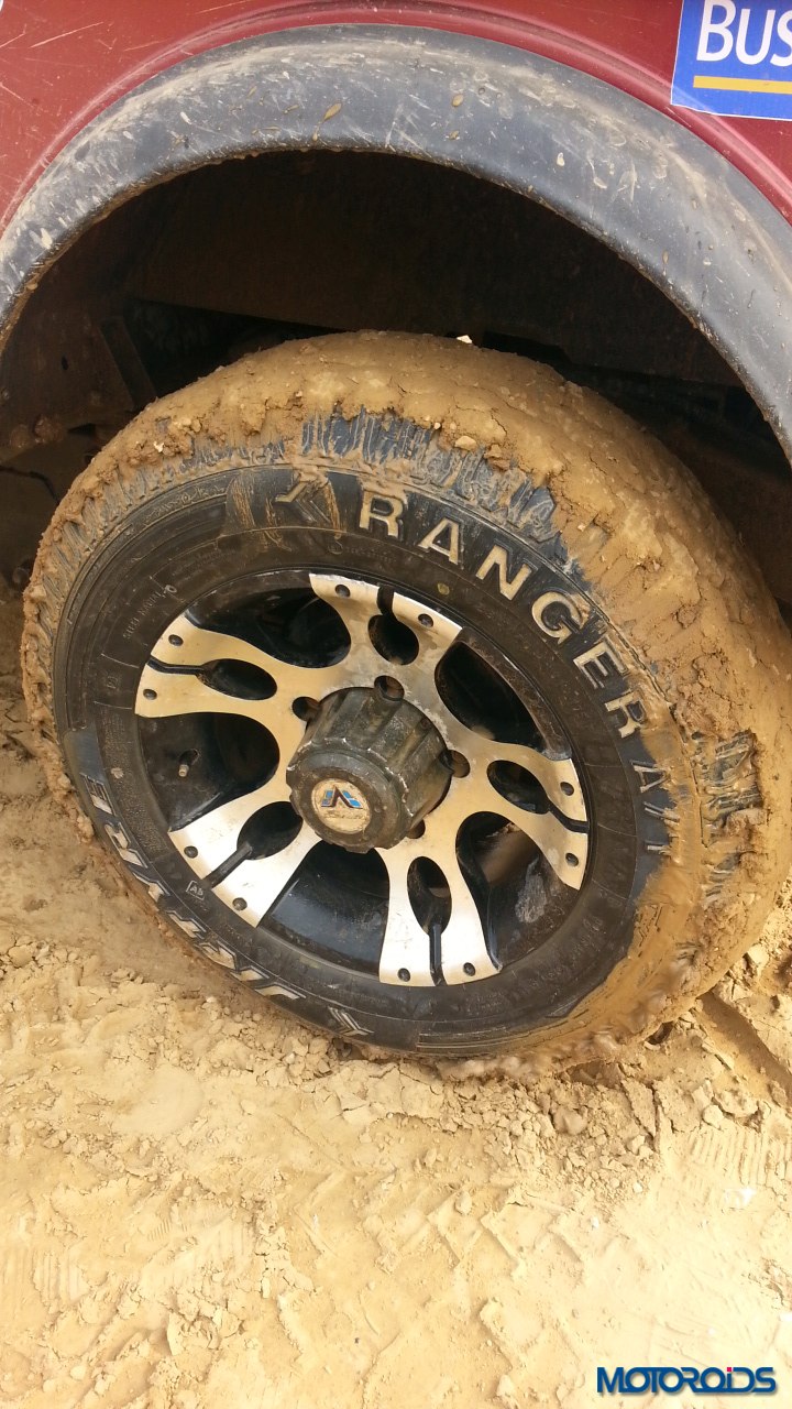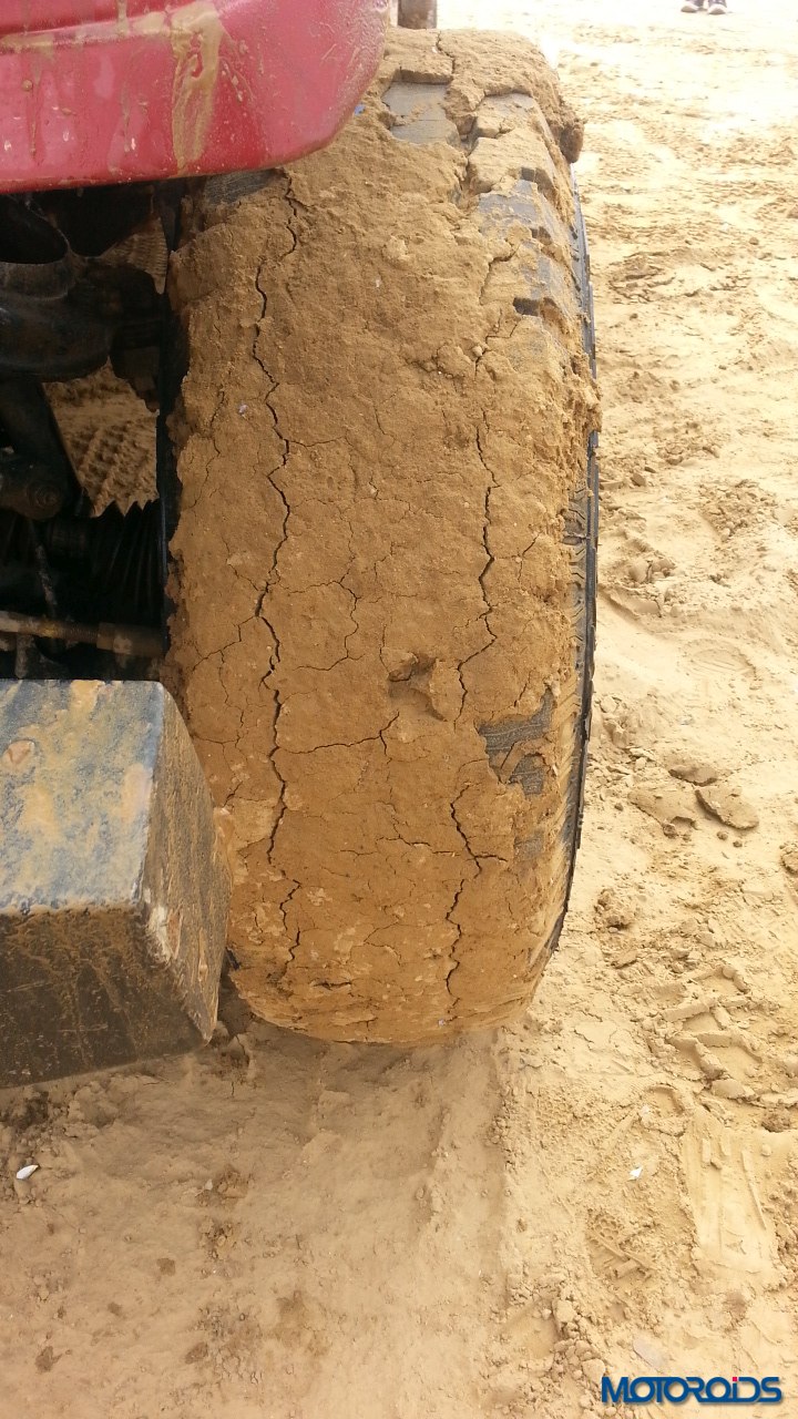 The Plateau section was similar to the deep rut section, just that the inclines were above the ground rather than below it. Then came the real fun part – the mud section. A long pit was filled with water and we just powered right through it. While the tyres managed just fine, we did hear a scream from the oblivious photographer standing not too far away who shrieked in the fear of getting his expensive camera splashed. Thankfully no damage was done. The tyres did not spin or lose traction even in soft mud. However, once the mud gets into the grooves and sticks there adamantly, you do experience some wheelspin .