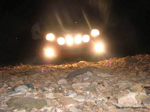 In the meanwhile, we were struggling to find our way out of the forest. By that time, 4-5 other cars had joined the party with everyone pointing in different directions. It was @0200hrs, and comfortably cold. The poor Punto took quite a beating here. This is where we lost the first of our mud flaps, and the entire cladding of the rear left wheel arch. But hats off to the engine guard, and the tank guard, none of the stones caused any damage. The Punto is not just a looker, its tough too.