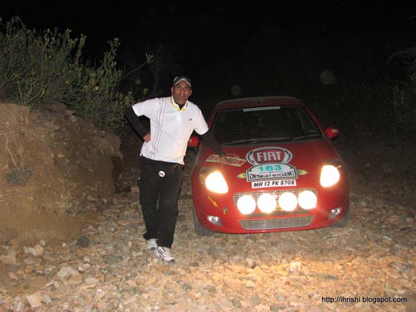 The organizers too were having a hard time managing all the people, and setting up the start order. Ultimately, it was a First In First Out starting order, and finally we were off. Since we had a lot of time to cover, before reaching Shakunt Resort, we took our time and went at our own pace. Filled up the Punto’s tank on the way. The Punto’s such a head turner. Specially in the small towns, and villages, its got a universal appeal. On reaching the resort, we retired to our room to prepare for the long night ahead. Changed into rally gear, dusted the helmets, filled the water bottles, and got ready. Soon it was time for the flag off and the Desert Storm had begun!