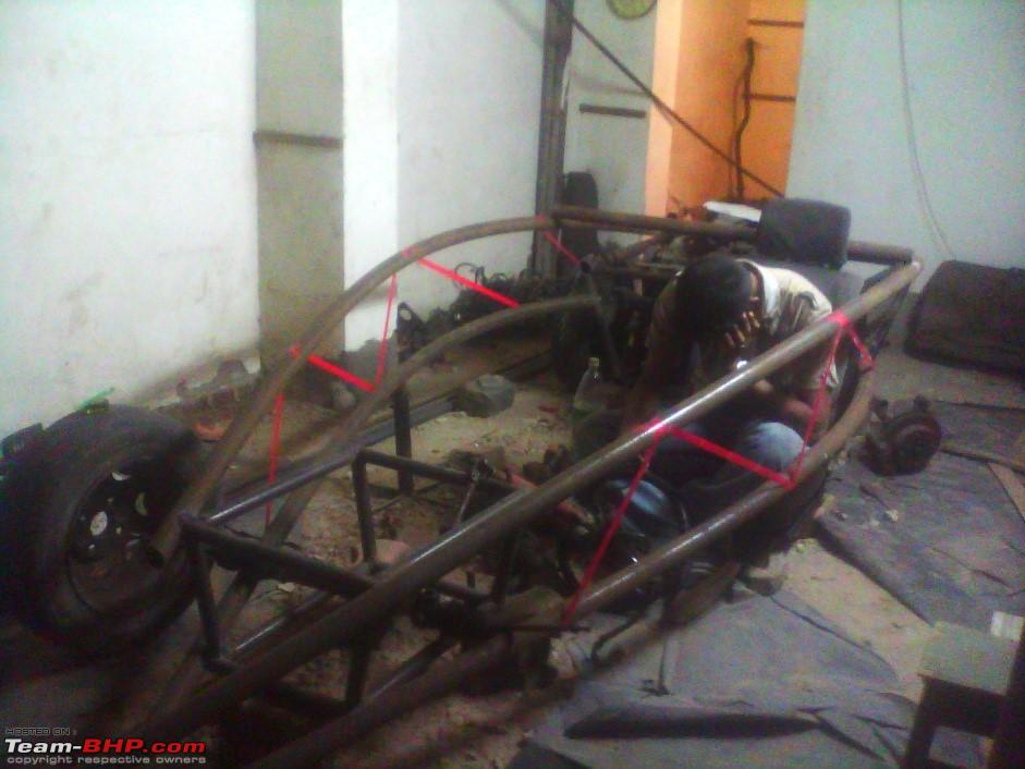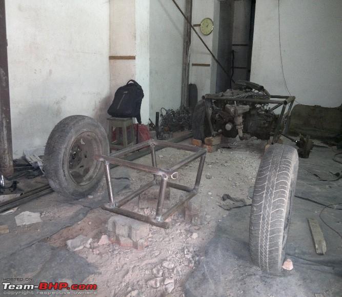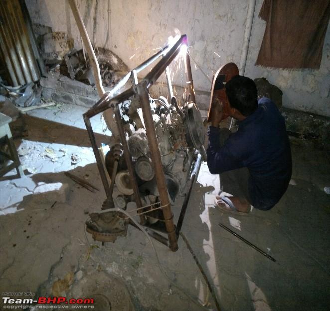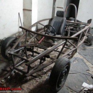 The simple cage was fixed around the engine, and care was taken to keep the centre of gravity as low as possible. The seats were optimally positioned after days of head scratching and the track width was increased without altering the steering geometry. 20 feet of MS pipe, got cut & edges got honed into measured angles to be welded as cross members.