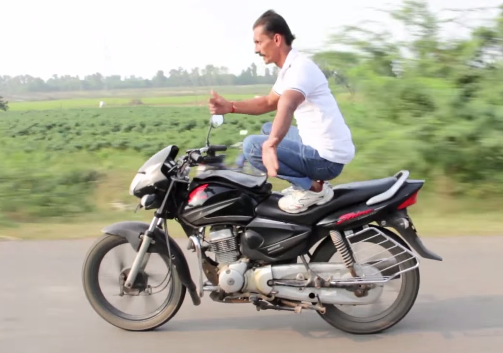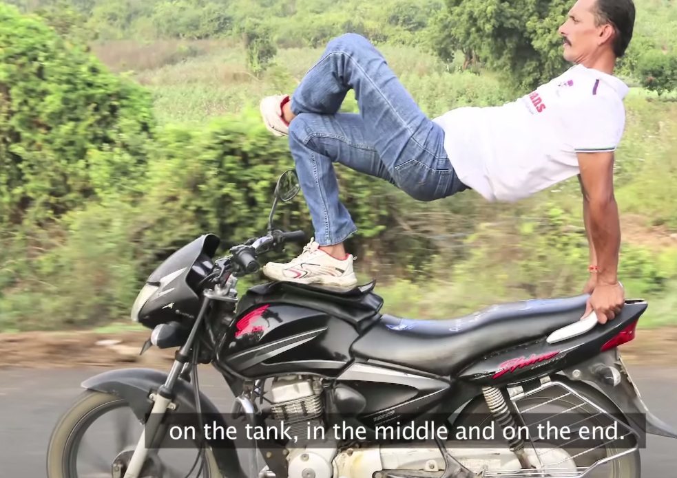 Think you’ve seen it all? 45-year old Gugulotu Lachiram from somewhere in Andra Pradesh shows us the delicate art of honing his yoga skills on a speeding Honda Shine motorcycle- without even a smidgen of safety equipment on board. Yes, you read that right. While motorcycle stunting is coming of age in India, this is not exactly where we want it to head.