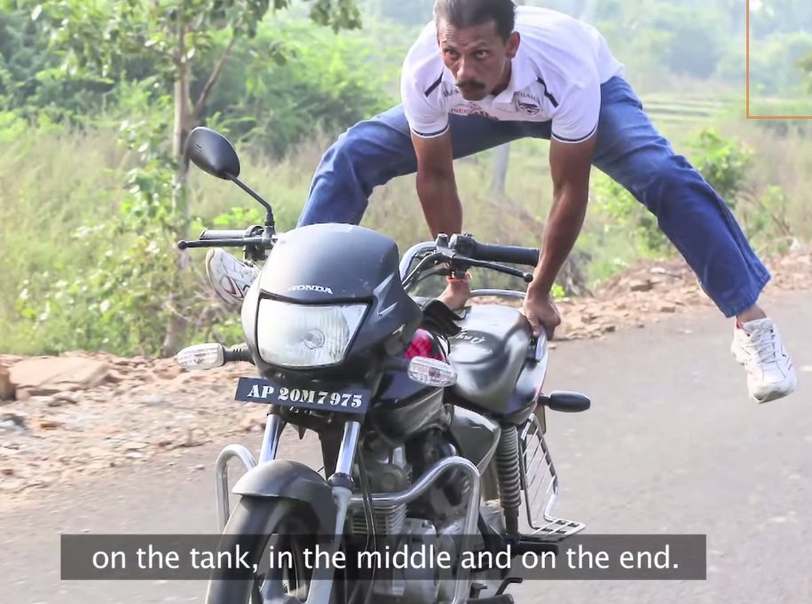 Gugulotu Lachiram, a farmer and a family man explains that he’s been passionate about yoga and motorcycles since forever. That led to the novel idea of mixing both of his favorite pastimes together, without referring to the sheer lawlessness of all of it . The “stuntman” replays this dangerous activity on a daily basis on his commute to work, with the bike riding at around 60 km/h  for 5 km on traffic strewn roads. Sometimes he is joined by happy-go-lucky pillions too!