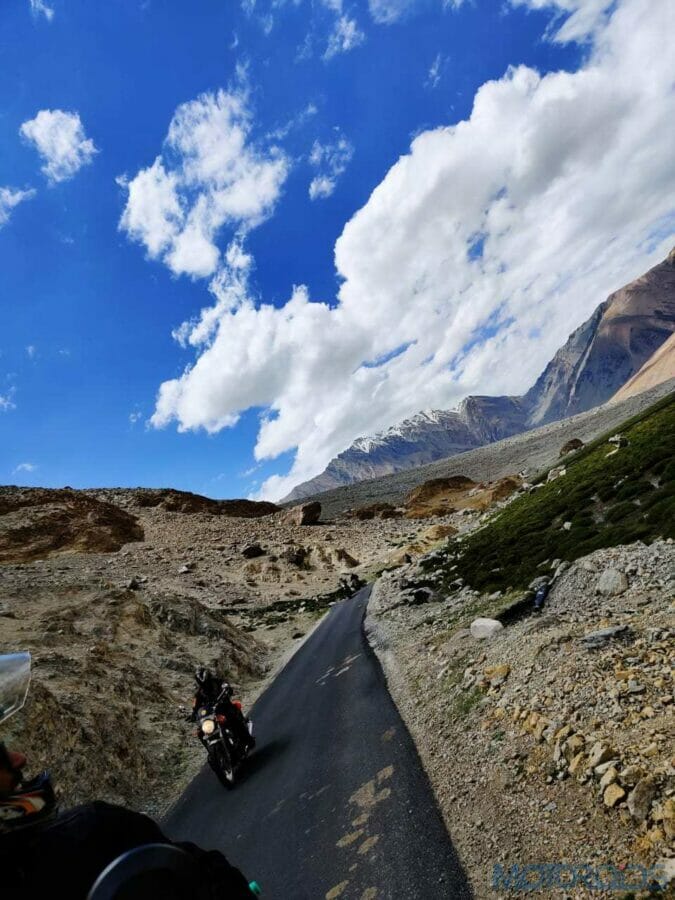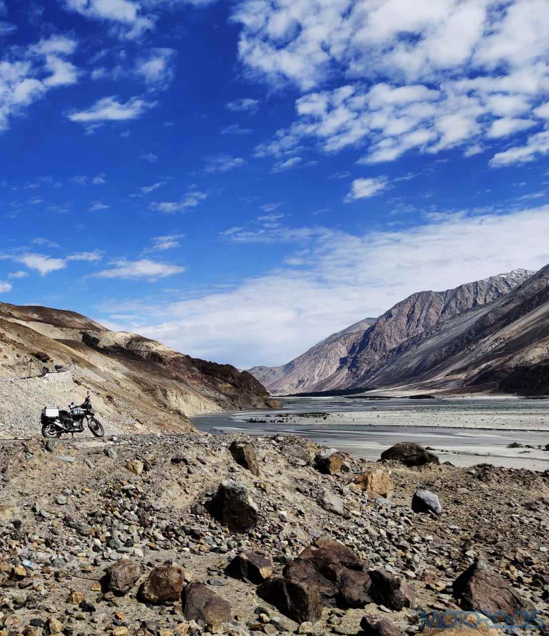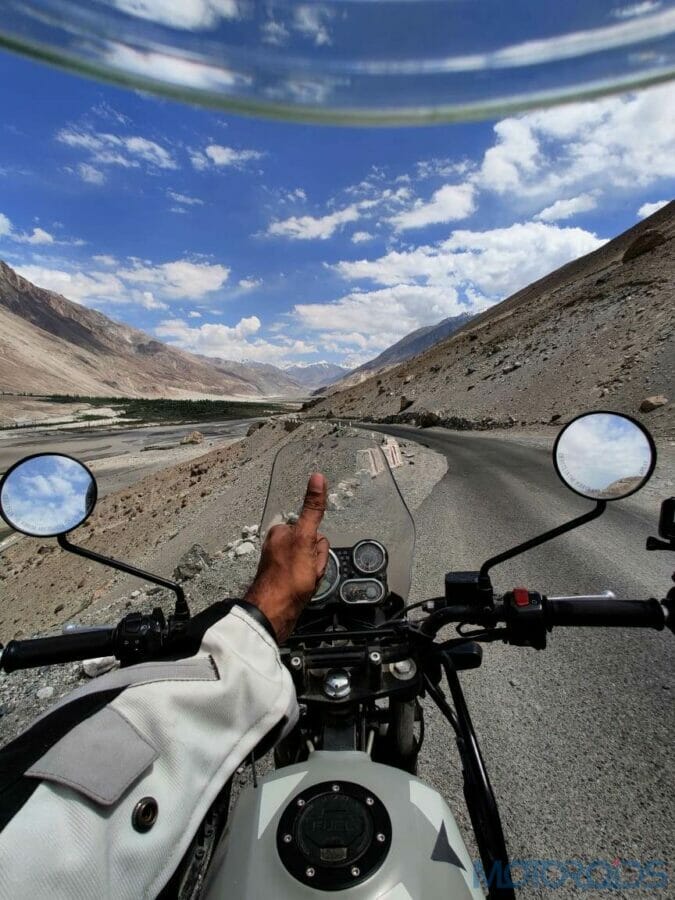You will begin to feel nature’s bite sooner than you realize as you climb towards Khardungla top. Which is about 40km from Leh but, it would be one of the toughest climbs you will make on two wheels if the weather is kind, if it’s not, god help you. Global warming has ensured that the glacial ice melts faster, which means we had more than a few bone-chilling water crossings. The zone post 16000 Ft to 18,380 at the top and then back to post 16000 Ft is the toughest to battle. You will lose your breath as you ride, if you stop to take pictures, you will realize that the energy level will deplete faster than the fuel in a hypercar around a circuit.