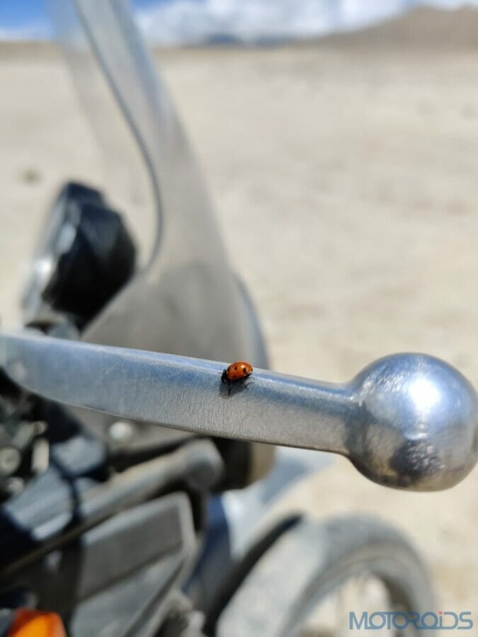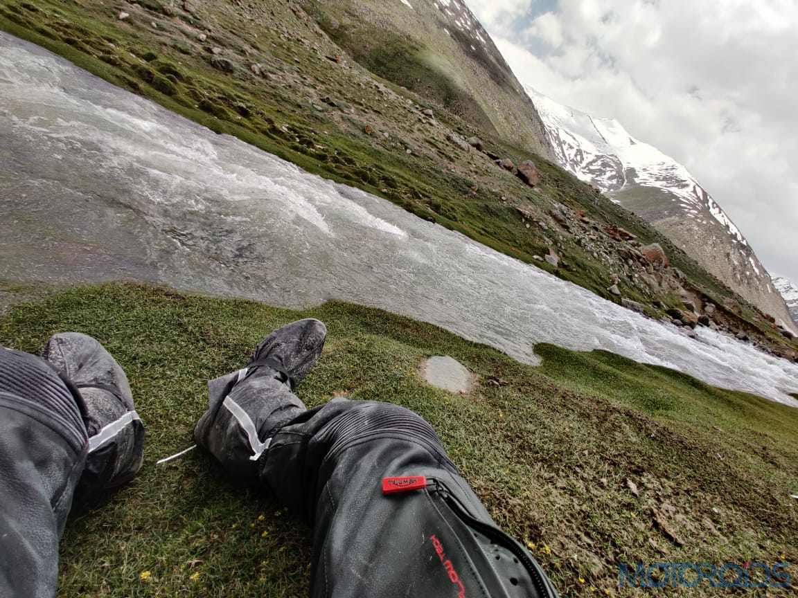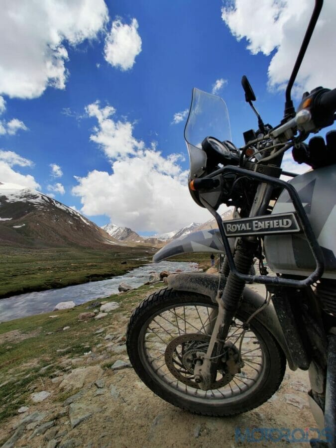 You really need to get in and get out of this zone as quickly as possible, while you keep breathing hard and really concentrate on the ride and the surroundings. I chose not to stop at the top, it was, as usual, crowded with tourists. I rode past the top and stopped at about 17000 Ft for a quick look, few seconds at max, without getting off my bike and rode on. The bike was simply delightful and already growing on me. It was the first time I had ever ridden on the Himalayan terrain on two wheels and it was the first time I had ever ridden the RE Himalayan. The universe conspired and how. Loose gravel, ice, rocks, quick manoeuvres were easy to execute, thanks to brilliant suspension setup and overall handling was on point. If things grew too tricky to sit and ride, standing upright would absolutely solve the problem as the bike corrected course effortlessly.
