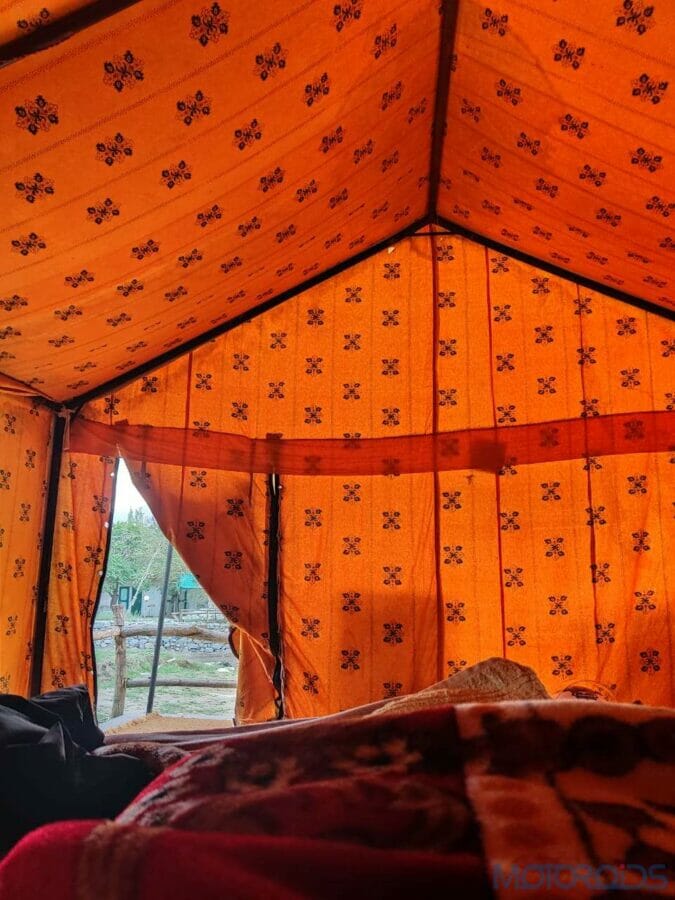 After about 6 hours of riding, and a few snack stops later, we arrived at our campsite – Royal Desert Camps, where hot food was waiting for us along with steaming hot tea. We had to get out of our gear, fuel up the bikes, eat food, rest up and be ready for the early morning 7 am ride out the next morning, to the legendary Pangong Tso Lake. But first, I must recharge.