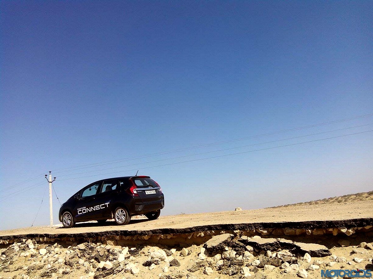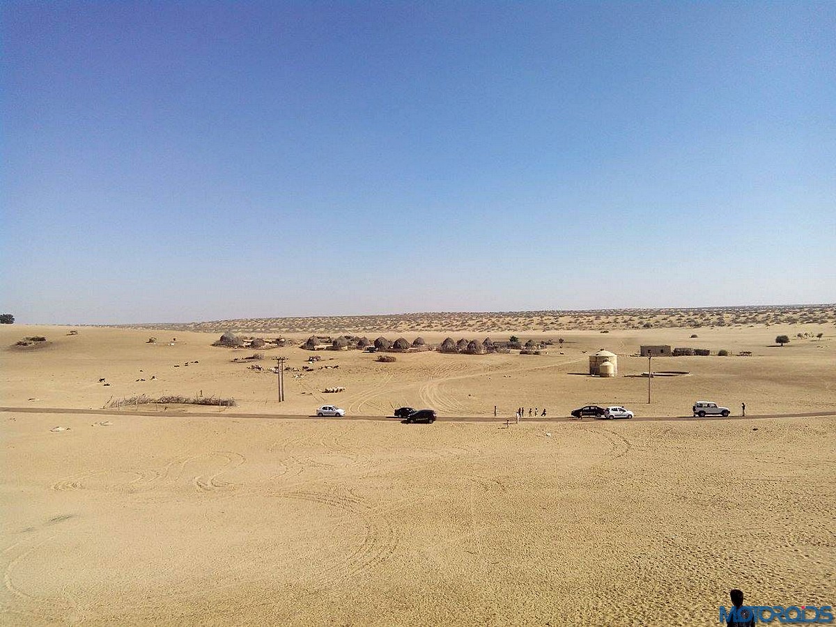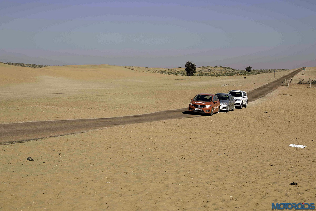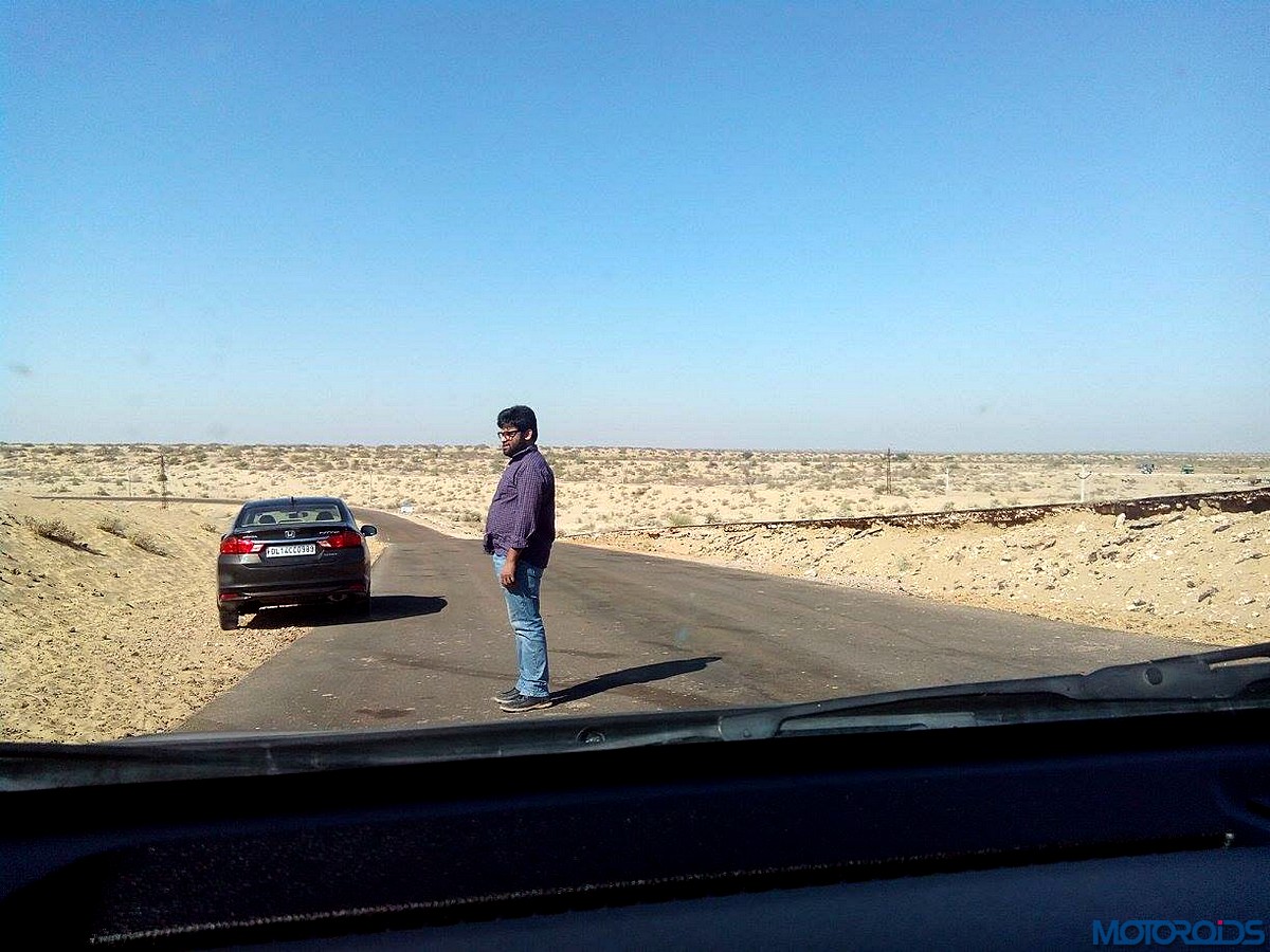 The next day was by far, the most interesting of the entire strip. I stuck to the Jazz, and along with a City in tow went to this place called Laungewala, some 120 kilometres away from Jaisalmer. The road to Laungewala from Jaisalmer is a ribbon of untainted asphalt that cuts straight across spectacular, ochre yellow landscapes juxtaposed against one of the bluest skies I’d ever seen.