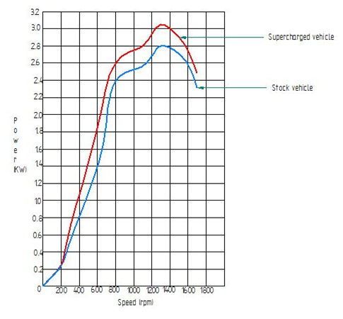 The results showed a significant improvement of power in the low speed range, but there was little improvement at higher speeds. Also an improvement in the maximum speed and acceleration was obtained. The fuel consumption was higher due to larger amount of a/f mixture being supplied to the engine and also due to drive being taken from the engine.