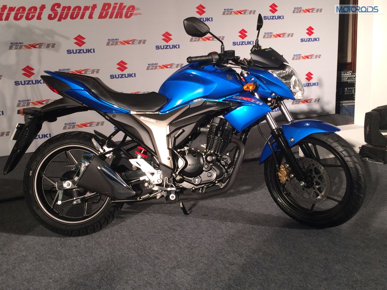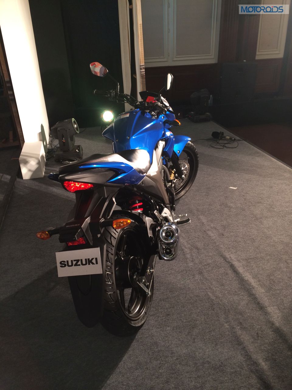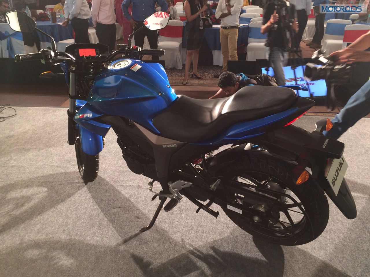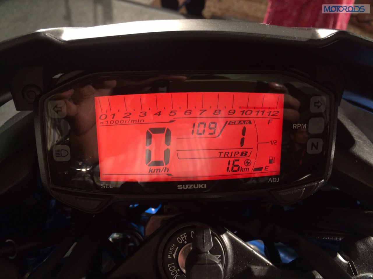 The Gixxer gets a short, flat handlebar finished in black which should help the rider with a comfortable upright riding position. The instrument cluster is an orange back-lit digital display with a speedometer, a horizontal tachometer redlined at 9500rpm, an odometer, a fuel-gauge, trip-meters and a gear-shift indicator, along with the basic tell-tale lights.
