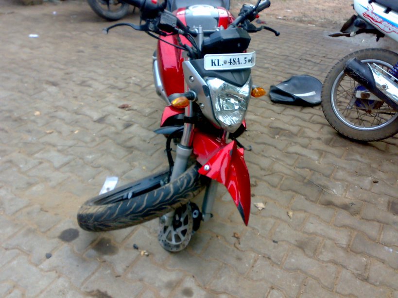 He realized the fact a little too late, and slammed the brakes hard. Moments later, he found himself on the road. He had missed hitting the car, but during heavy braking, the front alloy wheel just gave way, and all the spokes snapped clean from the central hub. Luckily, Binoy got away with minor injuries as he was wearing a certified, full-face helmet, but was still bed-ridden for a week. This incident is remarkably similar to the one involving the Pulsar RS200.