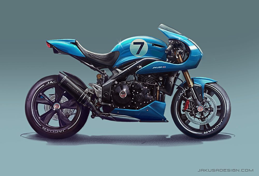 Hungary based Tamas Jakus/Jakusa Design has digitally synthesized two of UK’s contemporary design/engineering icons, the sinfully beautiful Jaguar F-Type Project 7 and the brilliant Triumph Speed Triple motorcycle. The results are positively jaw-dropping Triumph re-skinned with a splattering of Project 7 elements, and has been christened as the Jaguar Project 7MC