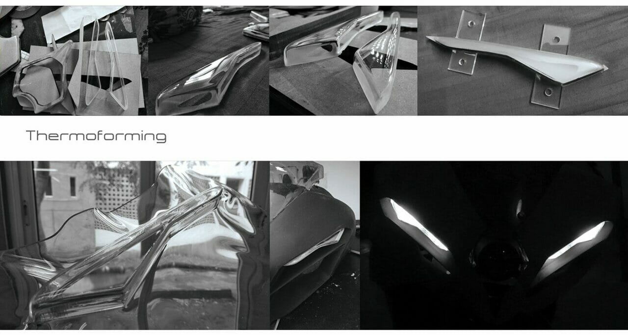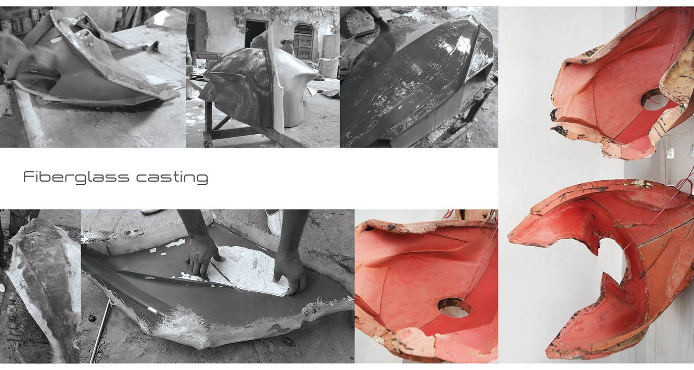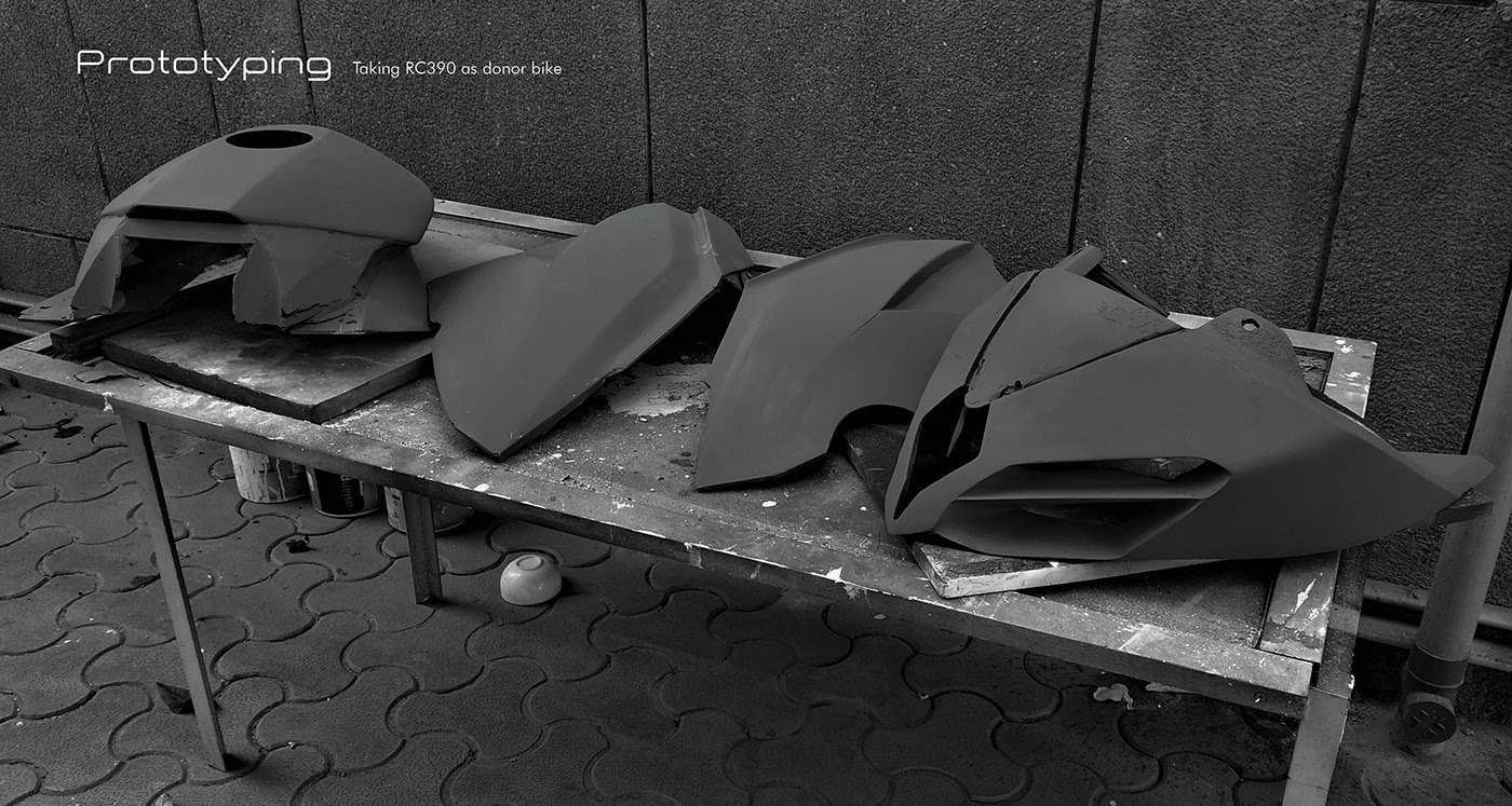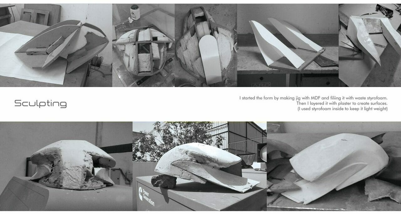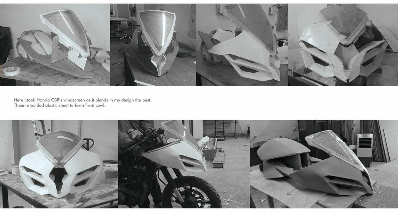 The paint scheme, decals and panels for the fairing, are all inspired by the surface texture of the Falcon and its body shape. Once the design was ready, for the prototype, panels were carved by making jigs with MDF and filling them with waste styrofoam. This was then layered with plaster to create the surface area. For the bike’s windscreen, the Honda CBR’s unit was picked since it blended in best with the design and thin, moulded plastic sheets were used to form the front cowl.