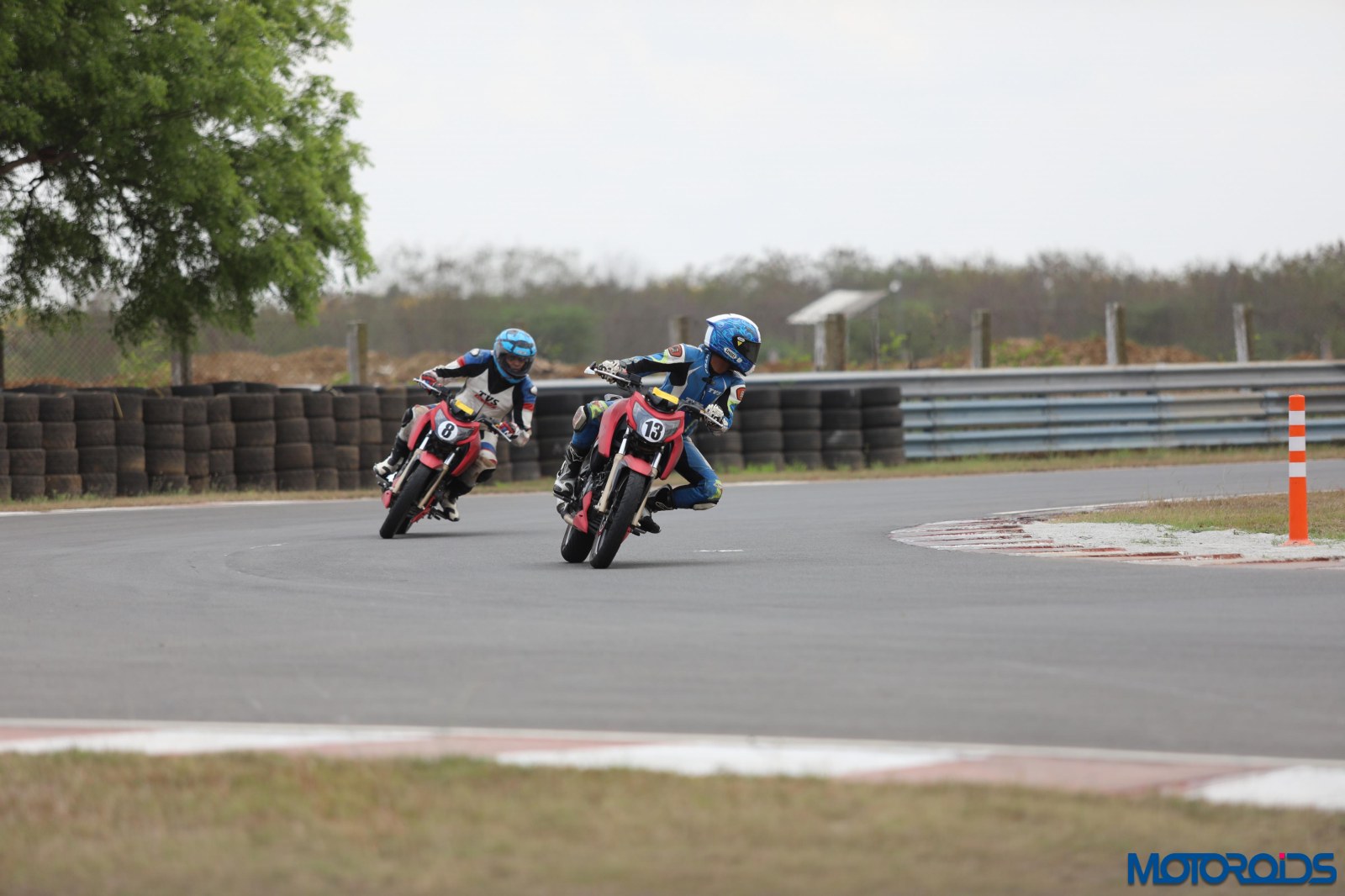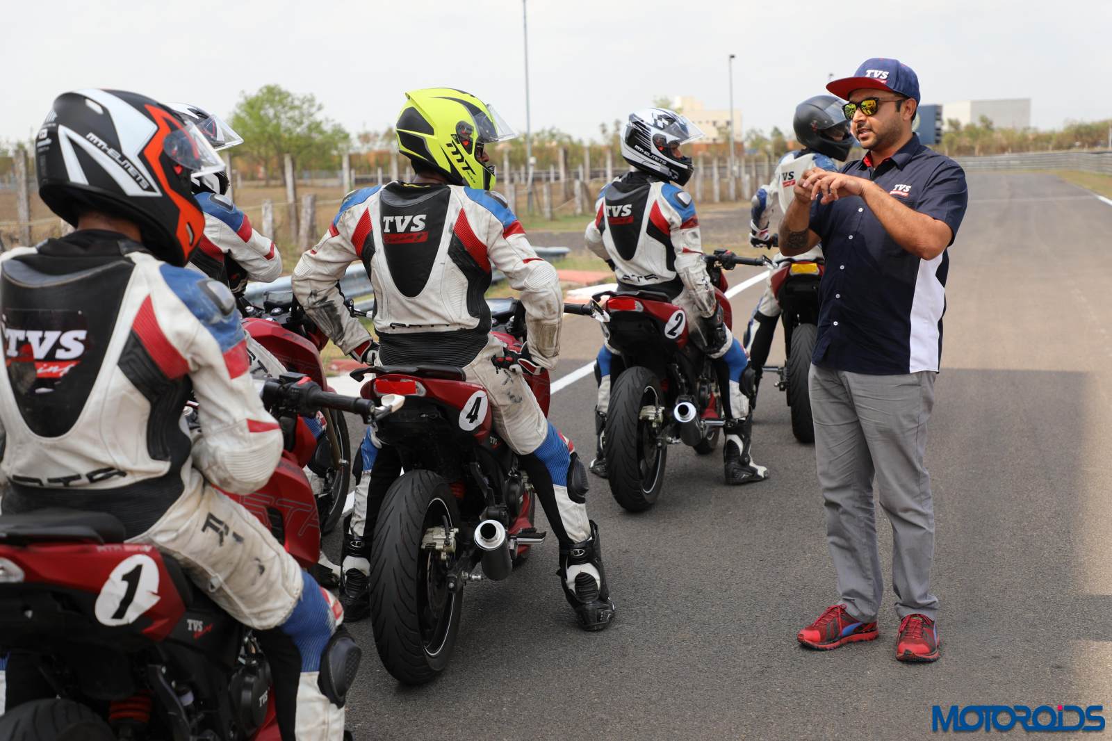 The first classroom session was done with and it was time to suit up and head out on our carburetted, race-spec TVS RTR 200s to get ourselves acquainted with the track. The bike is pretty bog standard, except for a race-spec exhaust system and deletion of bits like the main stand, mirrors and the rear fender. Split into two groups, every rider would follow their leader (One of TVS’ Champion Racers) for a lap, who’d show them where the marshal posts are and we had to do that in 4th gear, without touching the brakes.