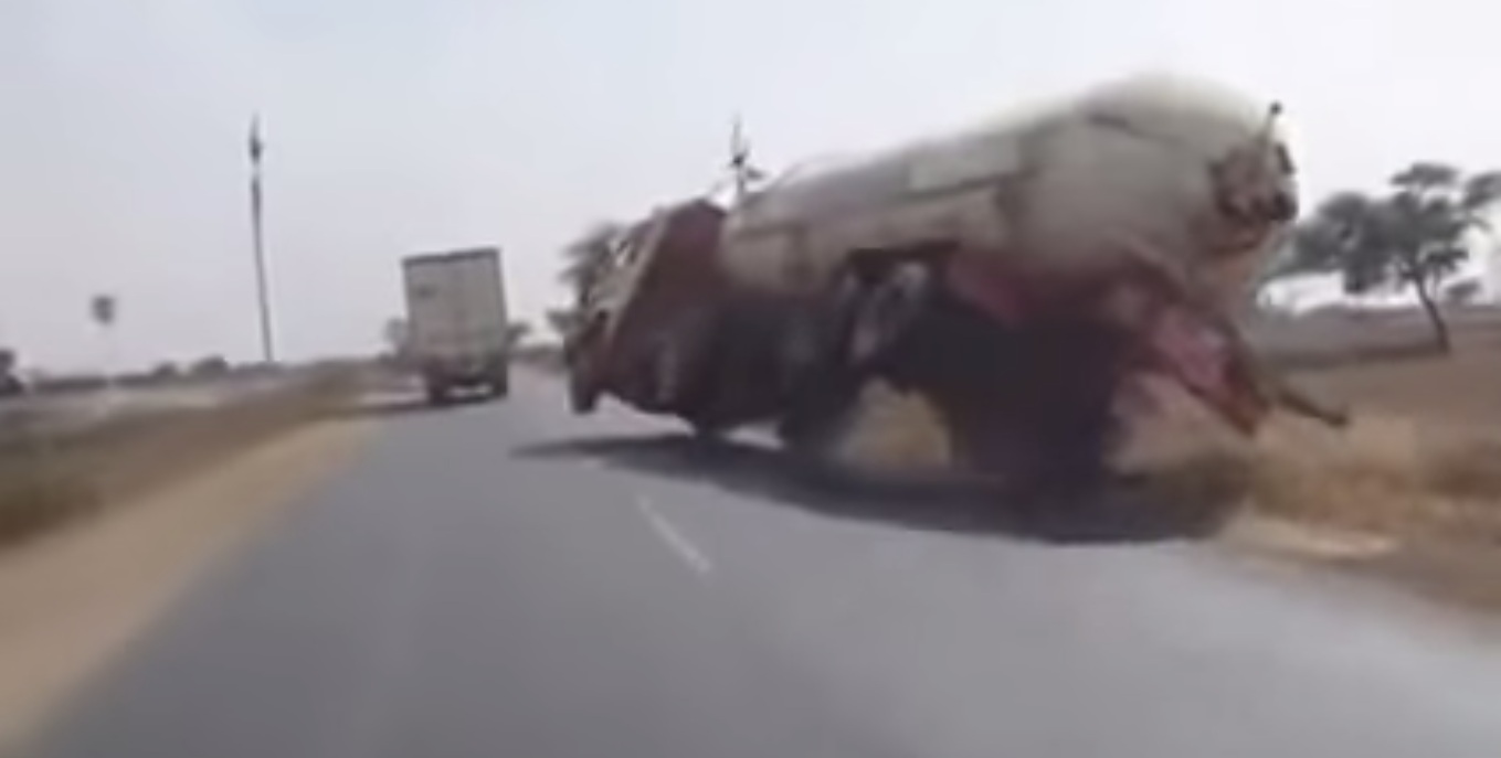 Dashboard camera footage always have something interesting. One such footage shows how an irresponsible driver flips his tanker in an attempt to overtake another vehicle. After several failed attempts and continuous honking, the tanker driver aggressively turns the steering to swivel out of control and turnover the vehicle. The driver also takes out an electricity pole which probably must have affected the locals with electric cut.