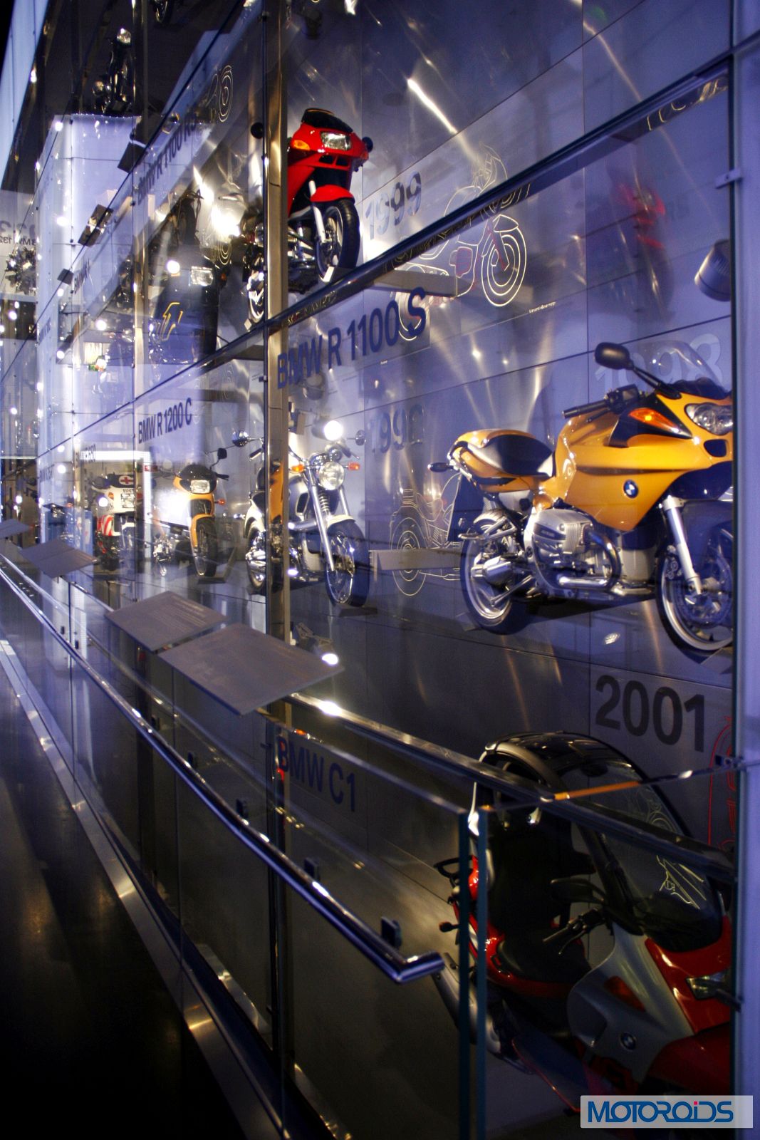 A vertically stacked glass showcase of BMW’s journey as a motorcycle manufacturer.