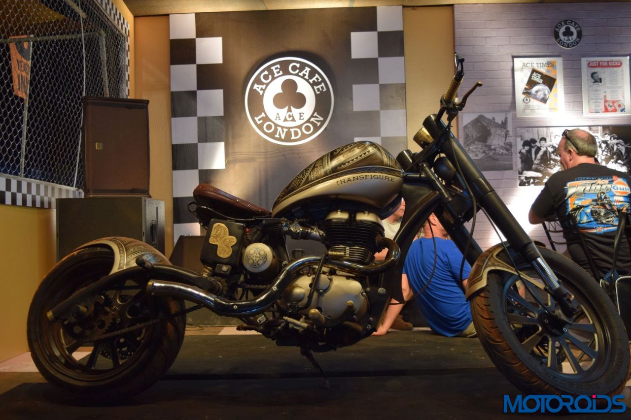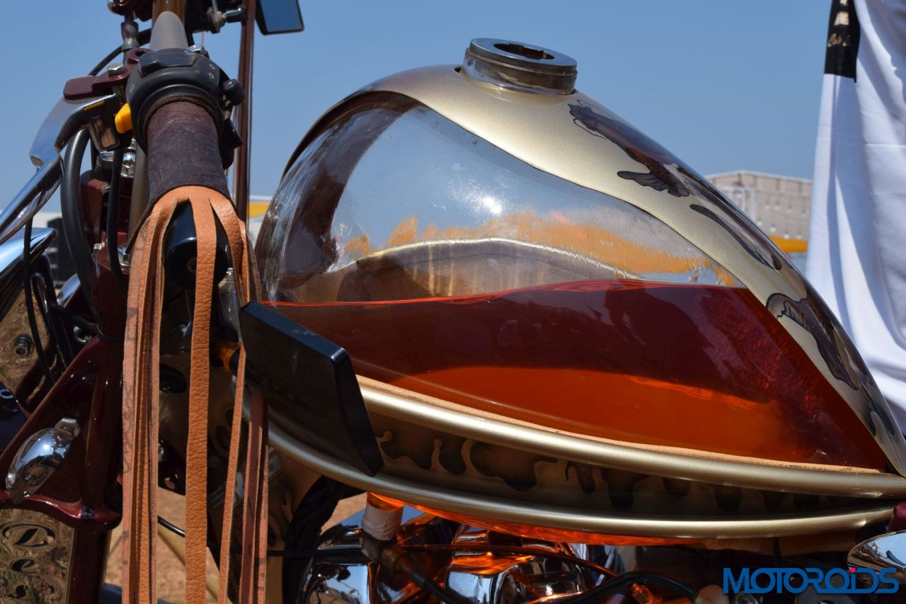 This RE underwent some serious customization. From painstakingly executed airbrushing to the leaf spring suspended front suspension. Dont miss the see through fuel tank
