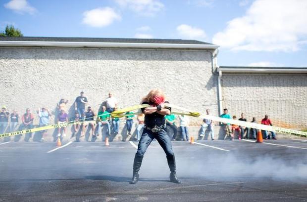 Juli is the official Guinness record holder for three variations of this trick, having performed the feat with one, two, and four motorcycles. According to her website, she is now gearing up to break the Guinness World Record for the heaviest vehicle pulled 100ft by a female, as well as the longest time restraining two Cessna aircrafts by a female.
