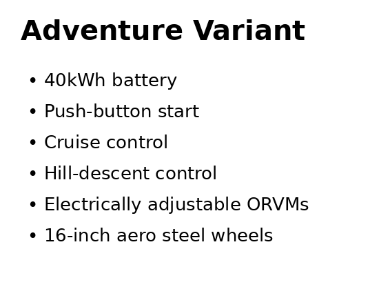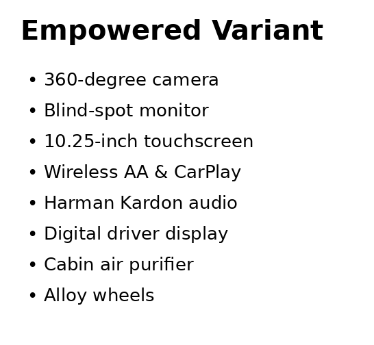 This variant focuses on driving convenience. It comes with cruise control, push button start, keyless entry, hill descent control and electrically adjustable mirrors. The wheels are bigger and aero optimised.