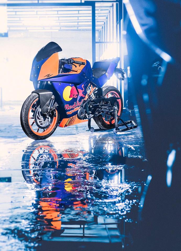 Its called the KTM RCX, and is a RC390 shrouded with custom, RC8 inspired bodywork that’s been fabricated in house. Inspiration for the headlamps come from the Concept RC690, and are original RC-sourced projector lamps mounted vertically.