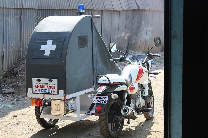 In its ambulance avatar. the Bajaj V15 can carry a patient with a side cart attached to the vehicle. The project was undertaken for Bajaj Auto themselves, who offered this bike to a man in Siliguri, affectionately known as ‘Ambulance Dada’. The passenger bed comes with a cloth cover as well, protecting the occupant from the elements. Below is a picture of this ambulance.