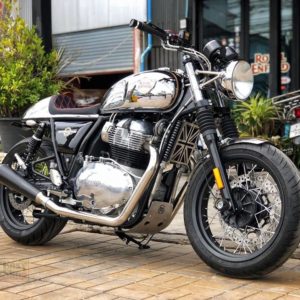 Since the stock motorcycle is just a seat with a fuel tank and the rest is all working components, the Interceptor 650 is already a great starting point for creative minds. This example here though reminds us a lot about Norton’s Commando Cafe Racer, what with the shine in its chrome, the carved in metal rear cowl, the proportions, the extended mounting points for the classic headlight, the saddle’s quilted pattern and that Union Jack cover for the radiator which looks right at home.