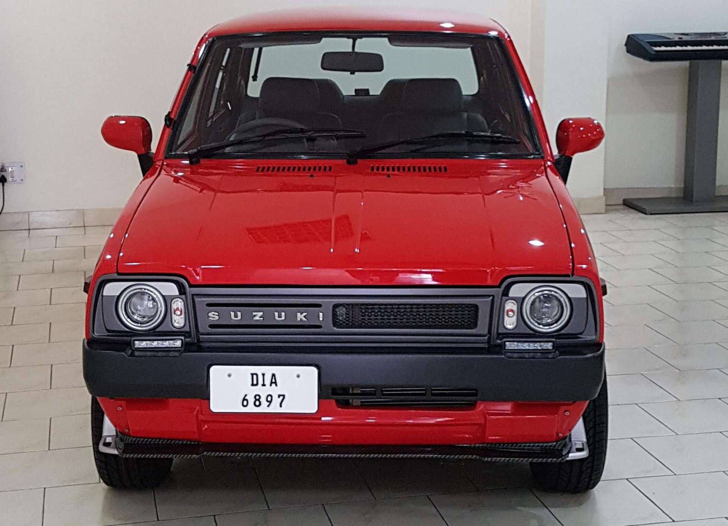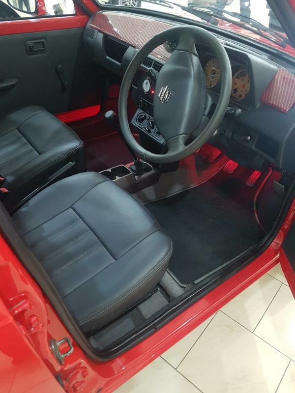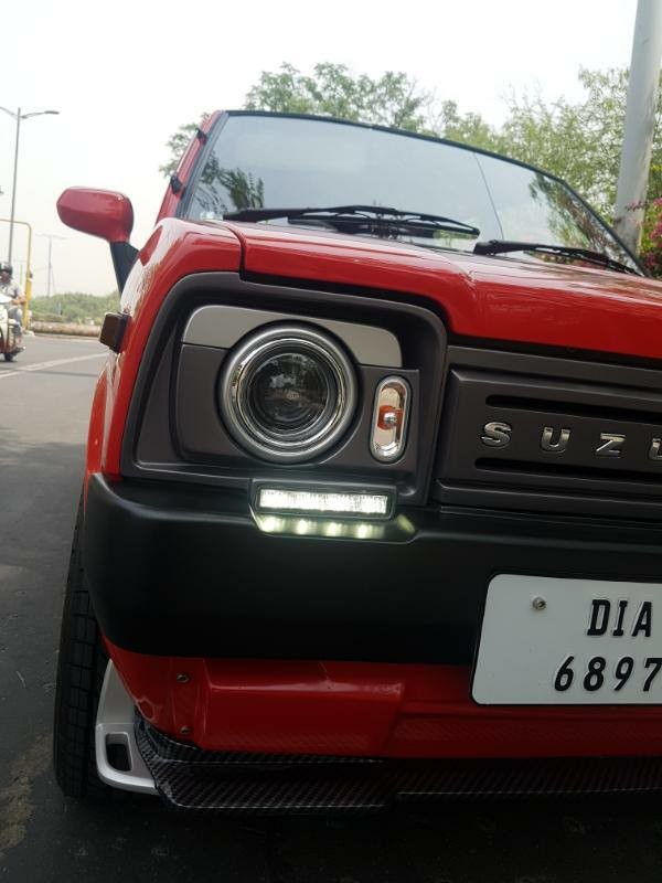 The fascia does away with the original grille, headlamps and bumper. Instead, there’s a new grille that somehow looks period correct with its asymmetrically placed Suzuki lettering. The grille is flanked by new age projector headlamps, while an exquisitely re-profiled front bumper makes way for the LED DRLs. Below the freshened fascia lies a front lip spoiler done up in a carbon fibre; both part and material feeling out of place on an old hat of a car like this. But who cares? Because it looks stunning. And precisely crafted.