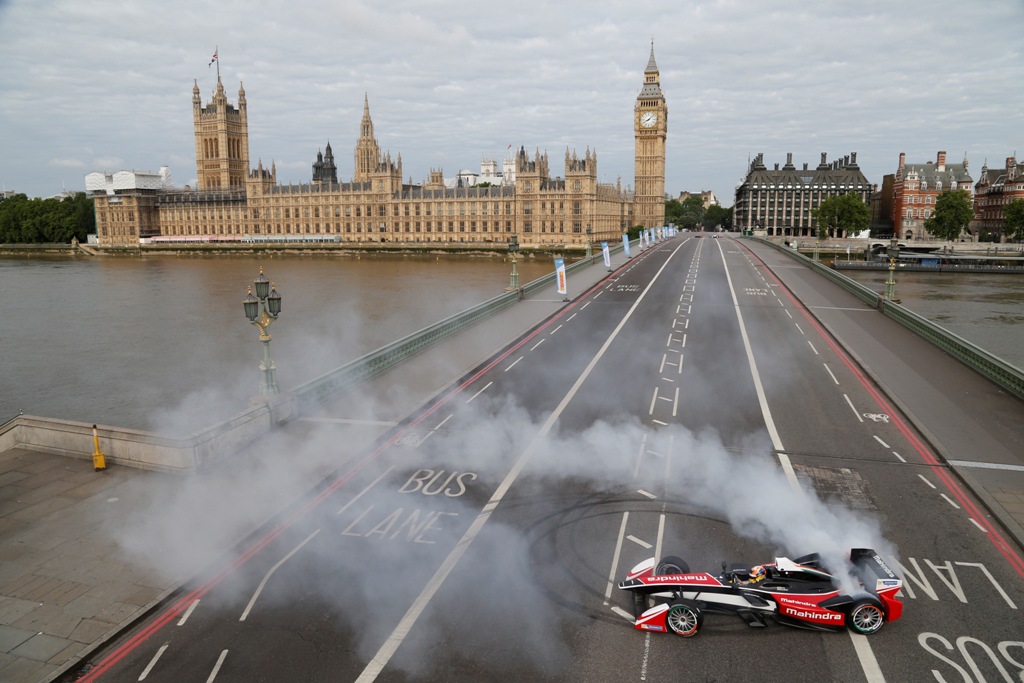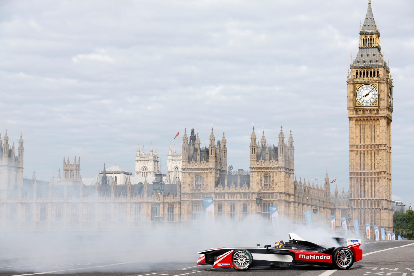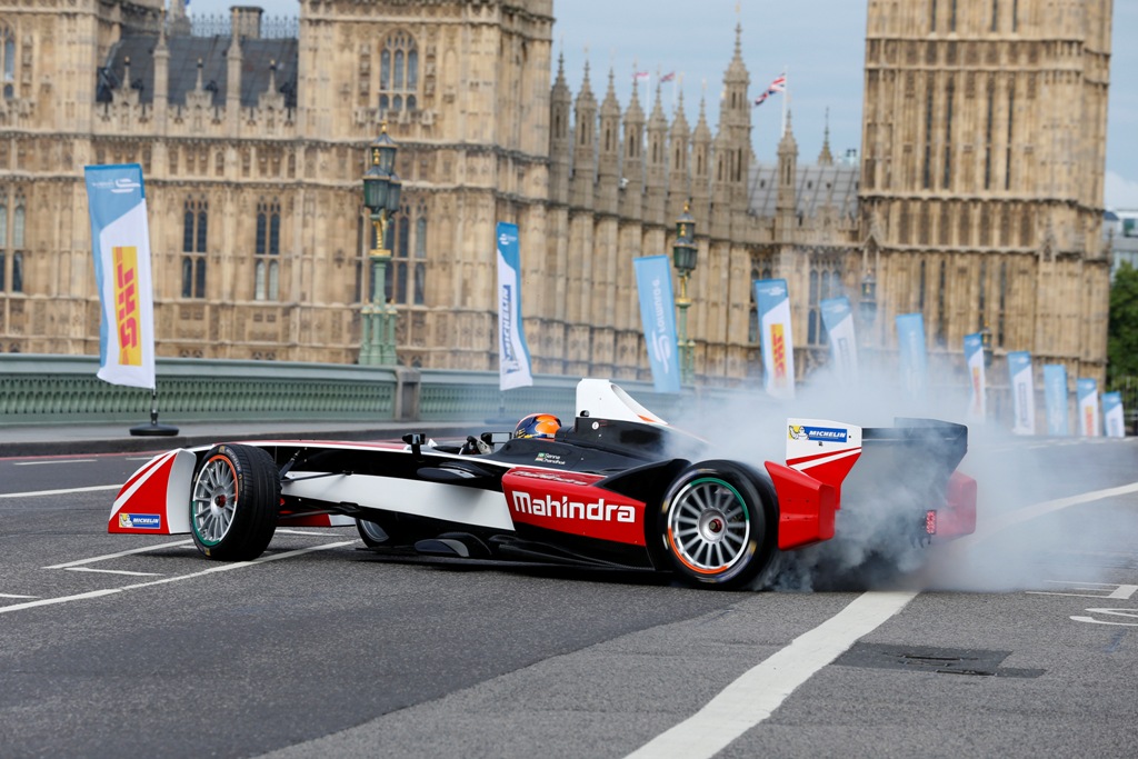 Karun Chandhok, who will be driving the Mahindra racing car in the 2014/15 FIA Formula-e championships, was performing doughnuts in front of the ‘Big Ben’ on the Westminster bridge. Karun was shredding rubber at the official Formula-e launch in London. He will be joined at Mahindra Racing by Bruno Senna, nephew of the great Ayrton Senna. The racing series for electric cars will feature two women drivers, Michela Cerruti driving for TrulliGP and Katherine Legg racing for Amlin Aguri.