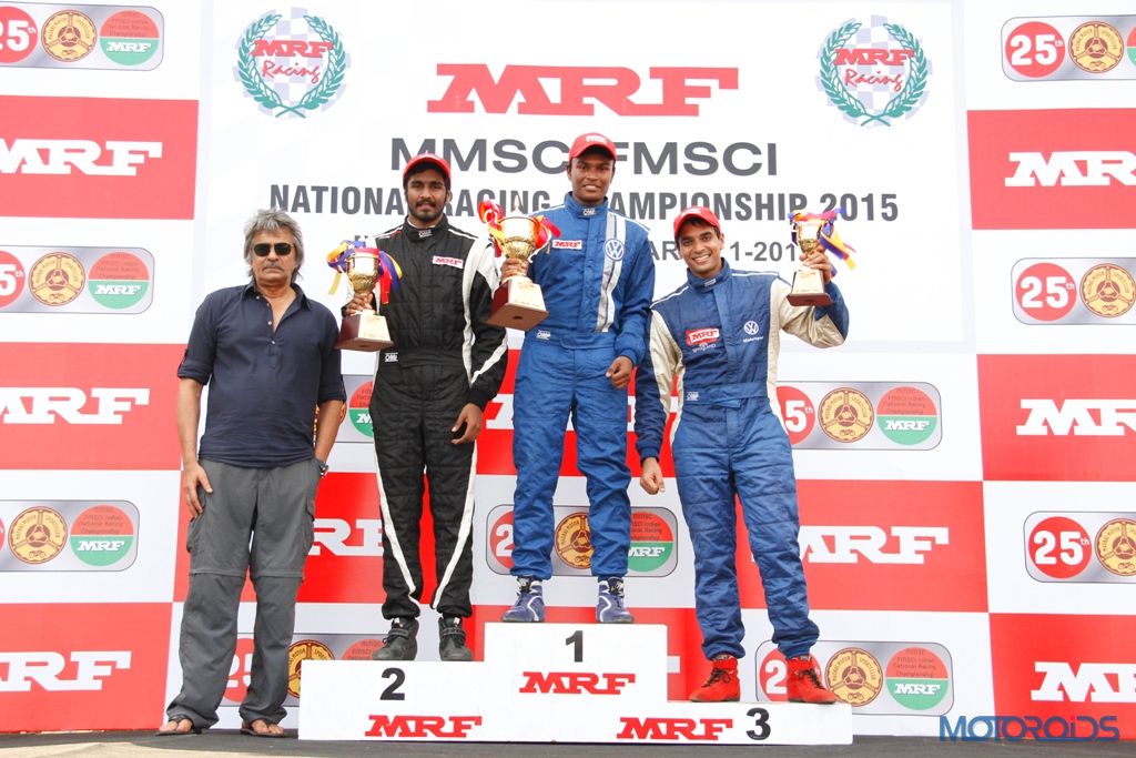 In Race 1, Karthik was in the lead post the very first corner, behind him Narendran held off Parekh and Trivellore to keep 2nd place. Karthik pulled away from the pack as Narendran and Parekh got into a fierce battle. A mistake by Narendran helped Parekh get a run on him and pass him on the straight heading into Anands corner. Karthik took the chequered flag comfortably to win his first race of the season and also ensure that there are 3 different winners from the first 3 races. Parekh finished in 2nd place with Narendran in 3rd and Trivellore in 4th place.