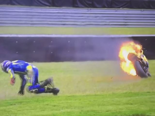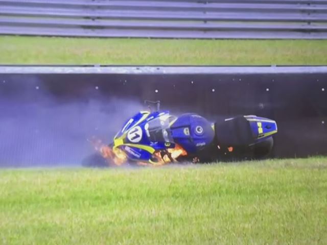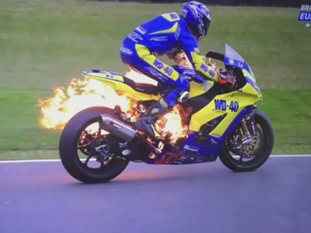 MotoGP riders live in the fast lane and during their high-speed track runs; the last thing a racing rider wants is his racing bike to go up in flames. In the case of British rider Taylor Mackenzie, his Kawasaki took on a whole new meaning to the term ‘Hot Ride’ during the British Superbikes Championship. Mackenzie was almost half way through the race when, without any warning, his Kawasaki Ninja ZX-10R erupted in flames.