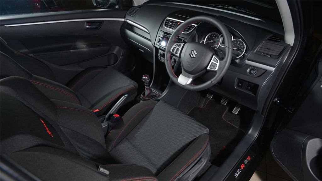 The visual changes on the 2013 Swift Sport SZ-R limited edition include Smoked Projector Headlamps, Revised Front Bumper, Cosmic Black Paint Finish, Contrast Red Painted Roof, Roof Spoiler and Wing Mirrors, 17 inch alloy wheels, Red trim on carpets and gear lever, All black treatment for interiors and red trim for seats.