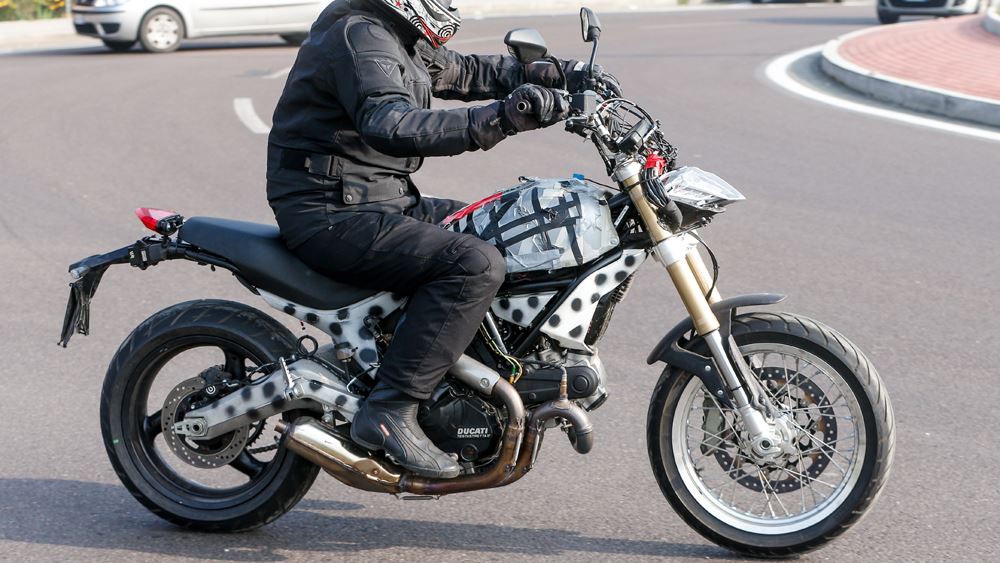 While the camouflage on the test mules prevents us from getting a good idea about the bike’s design, it does feel like the upcoming model would boast of a round fuel tank, angular upper engine and sub frame covers. These Ducati Scrambler images also show some hastily added Hypermotard parts, which of course, are a part of the  camouflage.