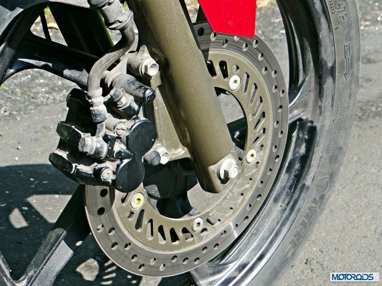 2014-Hero-MotoCorp-Karizma-ZMR-Review-Front-Disc-Brake-1While the front 276mm brake gave good response, the rear 240mm disc lacked the bite