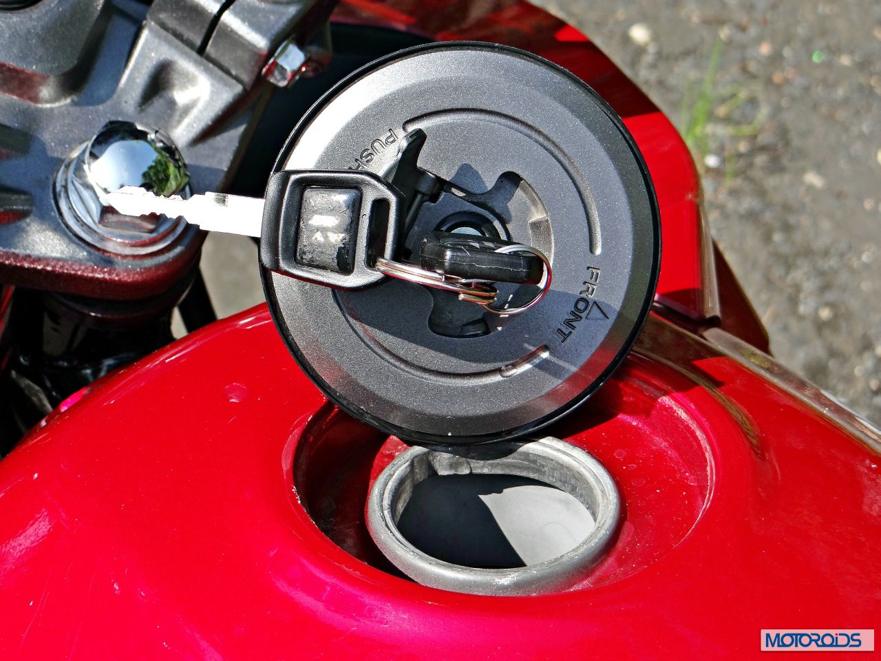 2014-Hero-MotoCorp-Karizma-ZMR-Review-Fuel-Tank-Lid-2The fuel tank holds sufficient amount of petrol for long highway rides