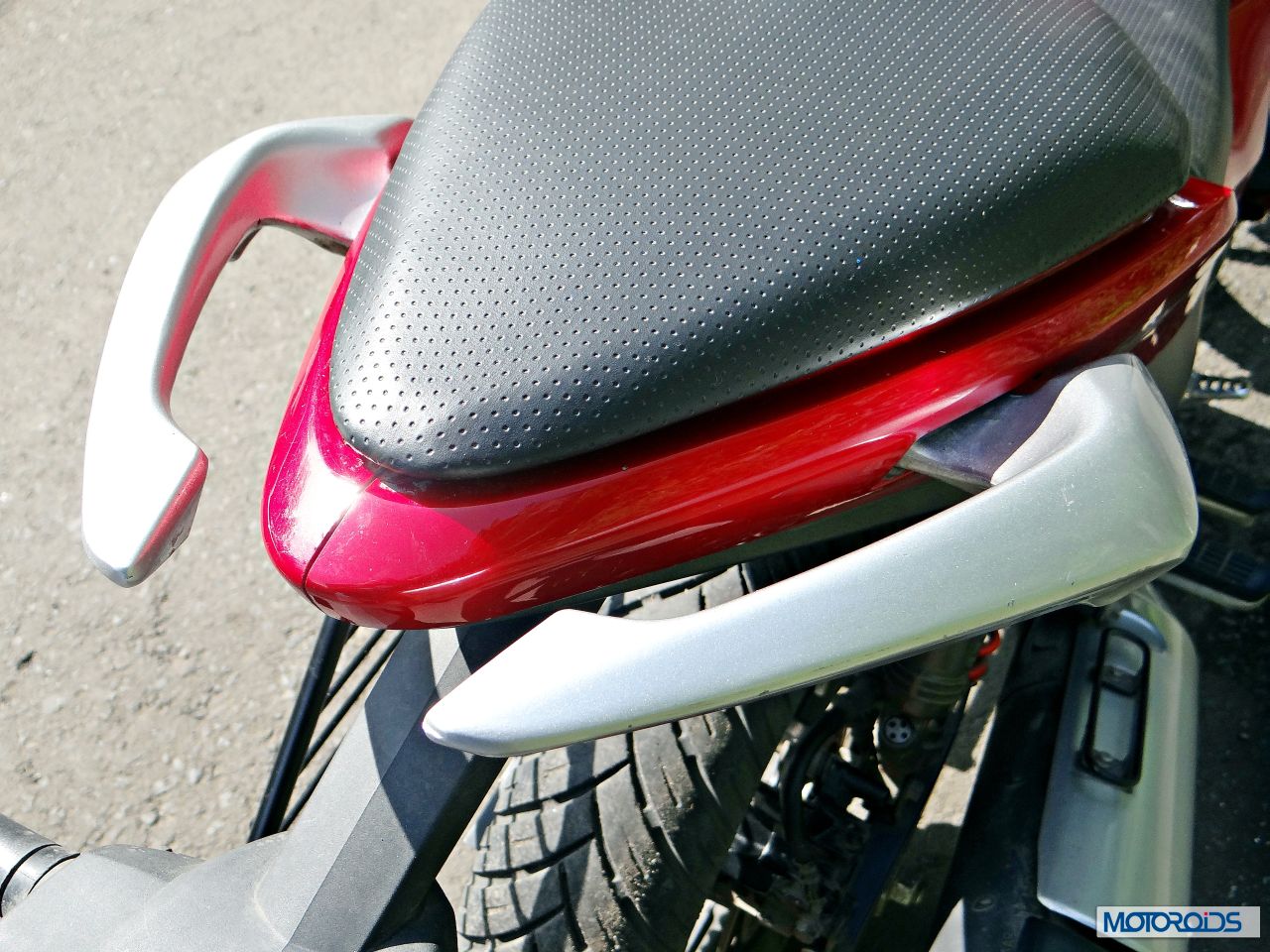 2014-Hero-MotoCorp-Karizma-ZMR-Review-Pillion-Grab-Rails-2The narrow rear section of the motorcycle and the lack of a rear fender would create a spray painting on the rider’s back