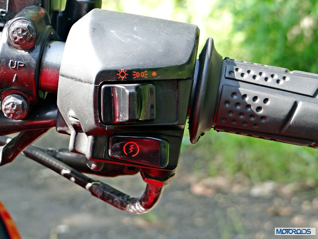 2014-Hero-MotoCorp-Karizma-ZMR-Review-Switches-2 2014-Hero-MotoCorp-Karizma-ZMR-Review-Switches-1The switchgear quality seems good but the turn indicator switch on the test motorcycle felt exceptionally stiff to be operated. Also, the absence of an engine kill switch was a little bothersome.