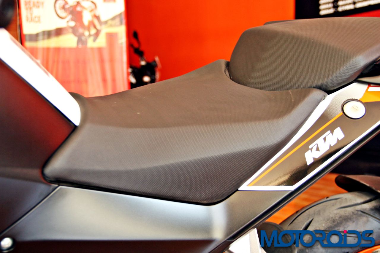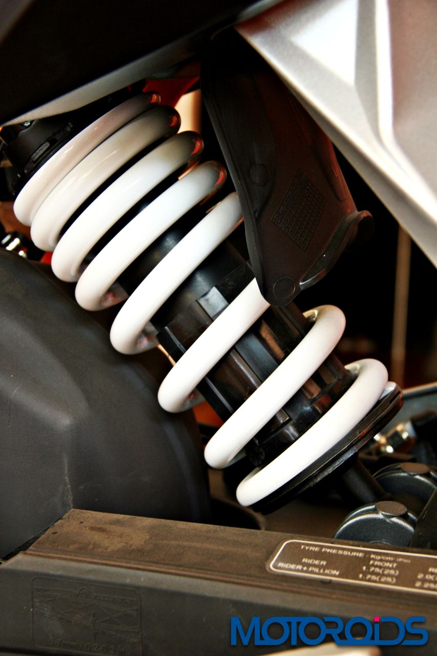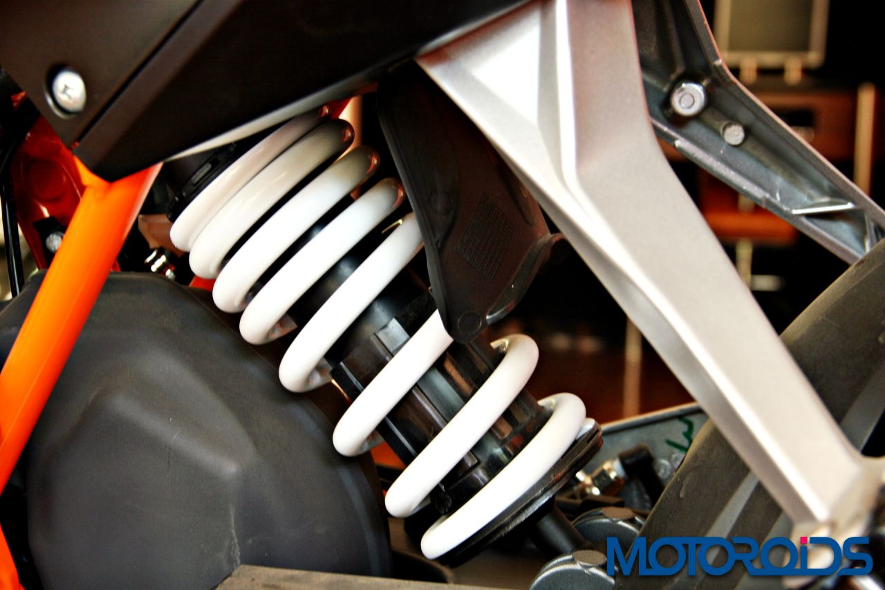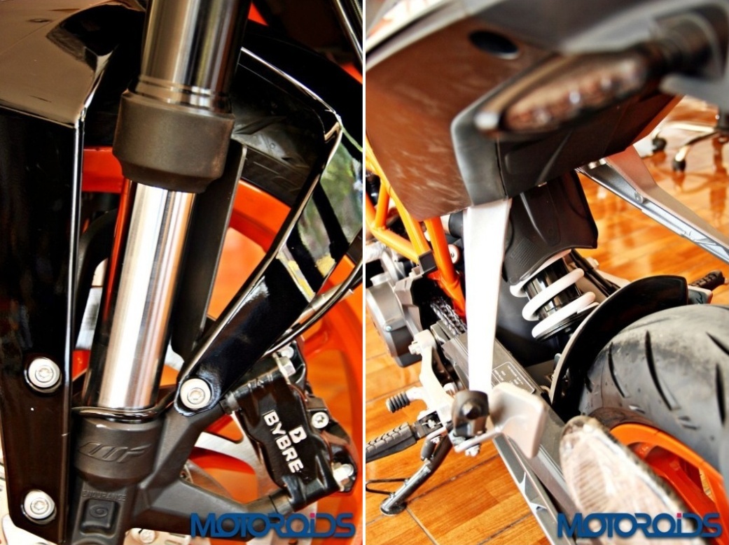 The LED turn indicators and tail light now receive a blackened at borders to make them look more meaner . The front upside down suspension also receives extra protection in the form of plastic cladding to thwart mud and muck flying off the tyres. The rear mono suspension receives a plastic cover inside the white shock absorbing spring while a small piece of plastic protector hangs from the motorcycle for protection from dirt flying off the rear wheel. Moving further, the handle grips, similar to the ones found on the KTM’s RC series, are now updated for better comfort to the rider.
