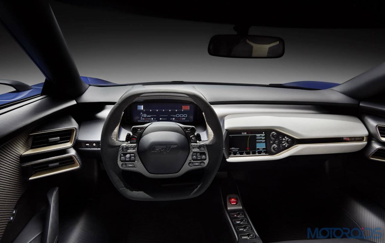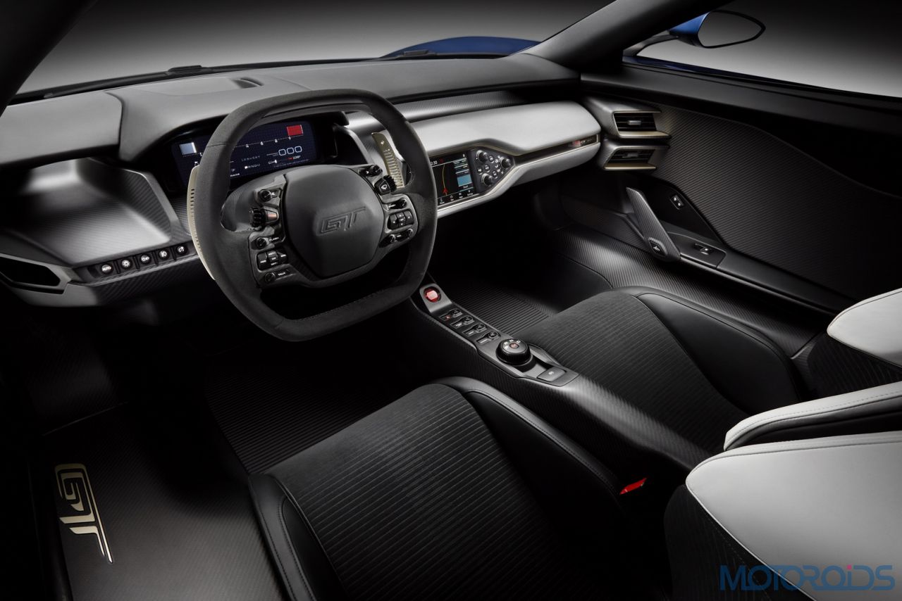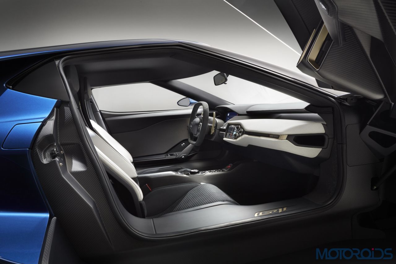 The narrow-profile canopy reduces frontal area, while the two-seat cockpit is accessed by upward-swinging doors, and features driver and passenger seats integrated directly into the carbon fiber passenger cell. Ford says that this configuration significantly reduces seating hardware and weight, and provides a consistent and direct sensory connection to the chassis. The fixed seating is combined with adjustable pedals and steering column to accommodate a very wide range of driver statures.