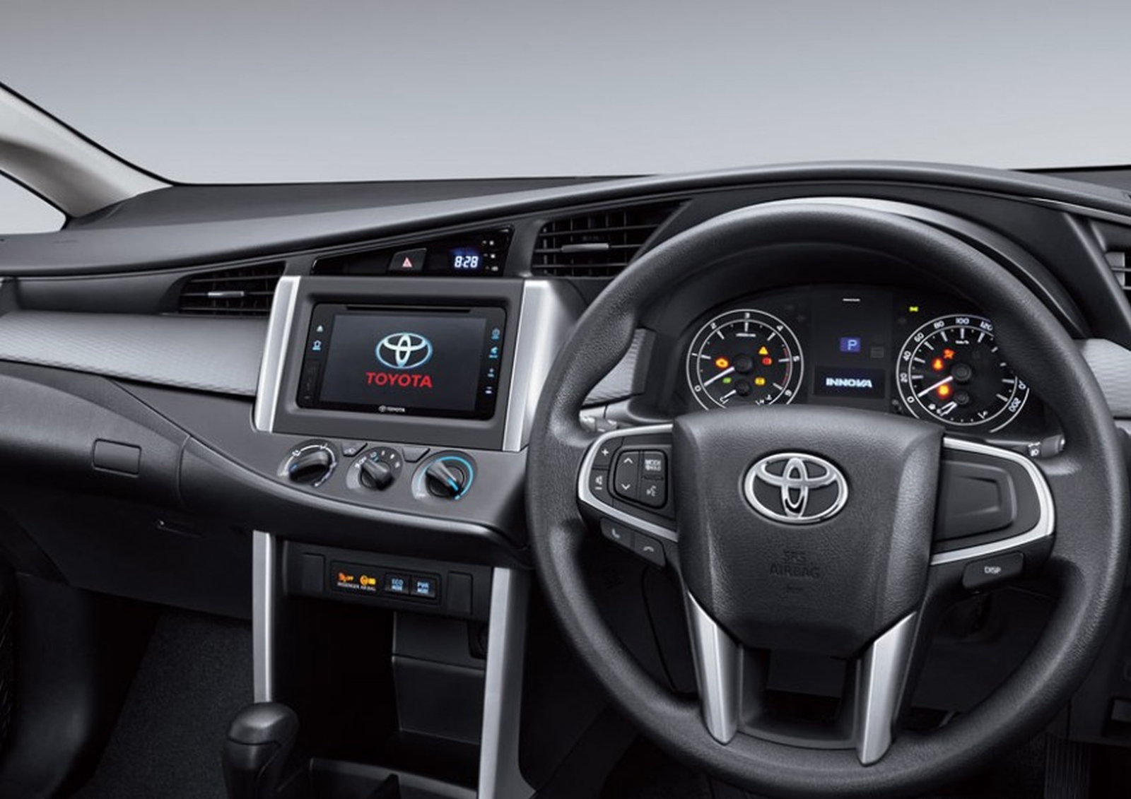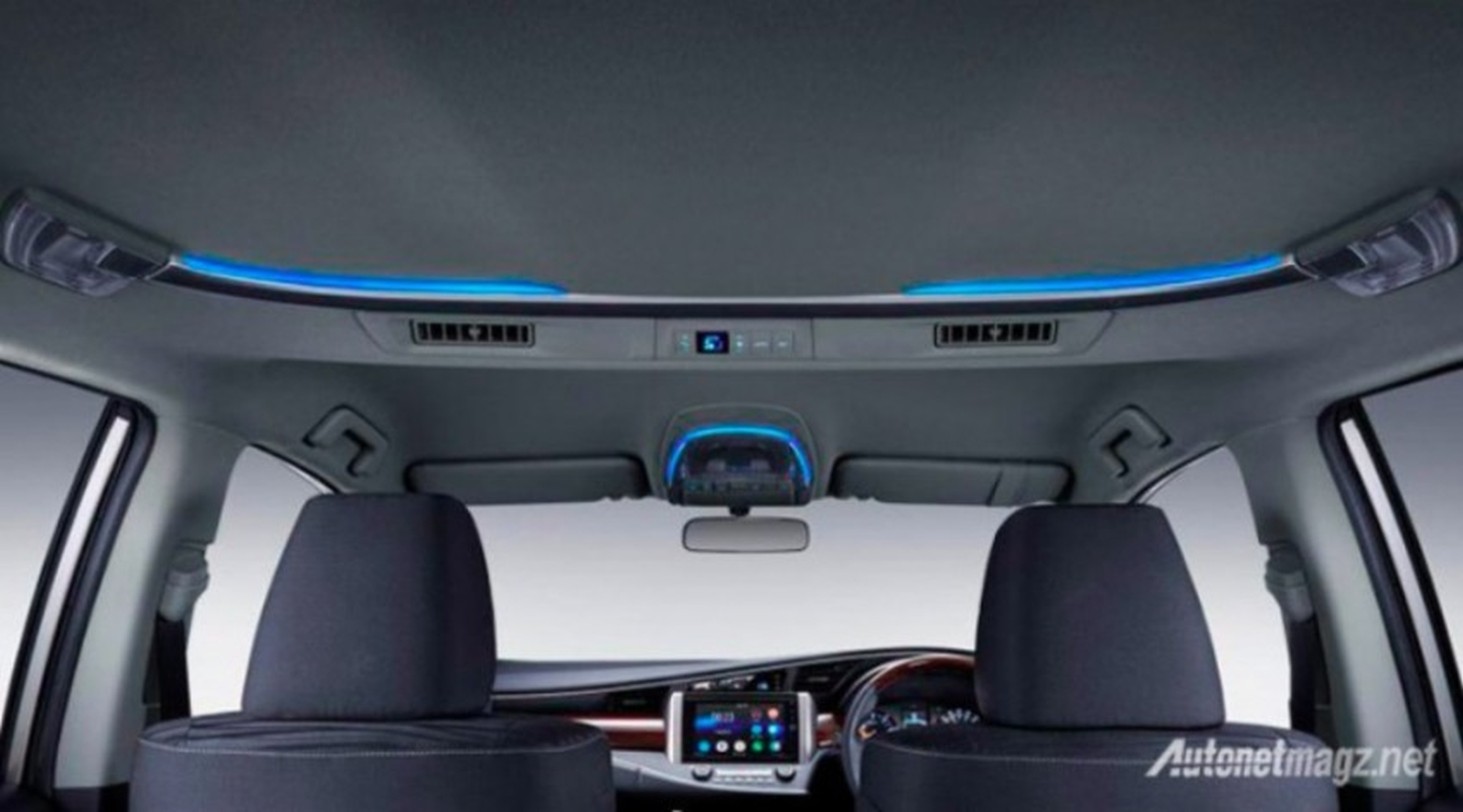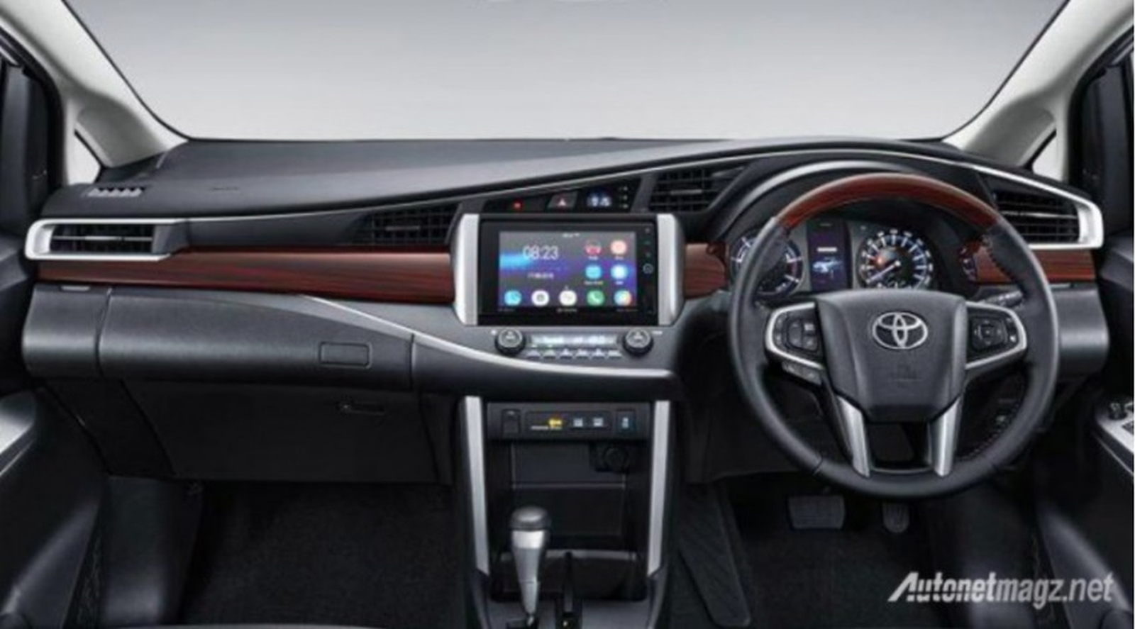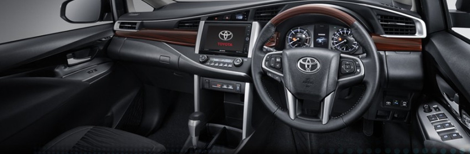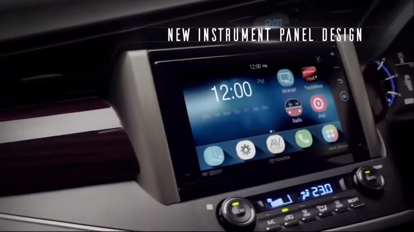 The interiors of this car include a greater number of changes as compared to the exterior such as LED illumination in the cabin, Auto A/C and glove box with a chiller function. The second row seats are replaced by 2 captain seats and features a twin cup holder in between. The dashboard features an LCD touchscreen display with voice command, an HDMI port and air gesture amongst other features. The twin cylinder shaped meters show rpm and speedo readings which are backlit blue and white as opposed to only white in the current generation Innova. The current 4 spoke steering wheel gives way for a modern 3 spoke steering wheel.
