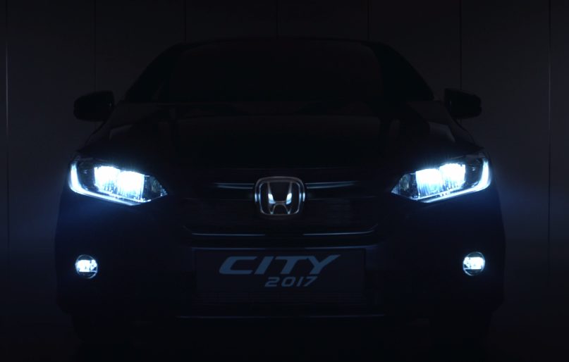 Teaser images reveal the front fascia of the 2017 Honda City as well as a few other details such as the LED headlamps with LED DRLs, 16 inch diamond cut alloy wheels, boot lip spoiler with LED stop lamp, electric sun-roof and a seven speed CVT gearbox with paddle shifters.