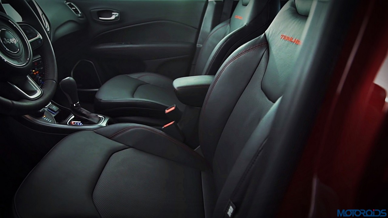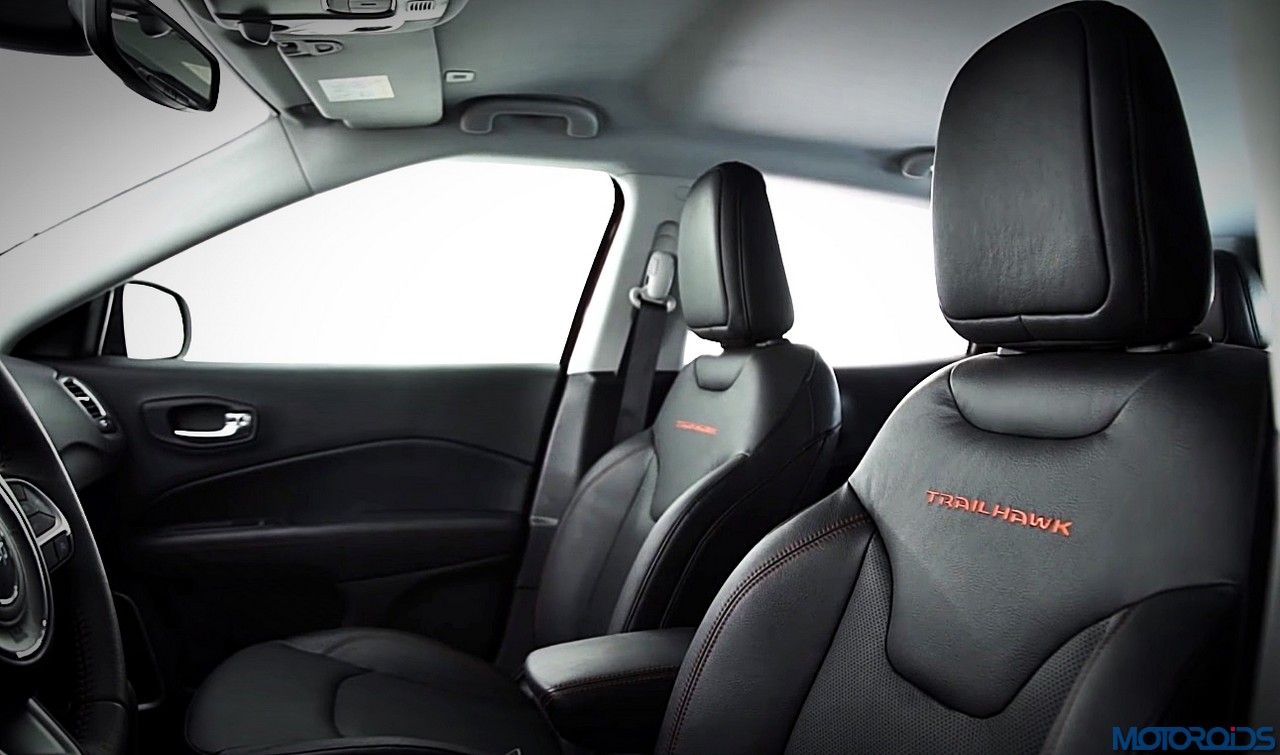 The black leather trimmed front seats in the Trailhawk grade get heavy bolstering, red contrast stitching and Trailhawk branding.