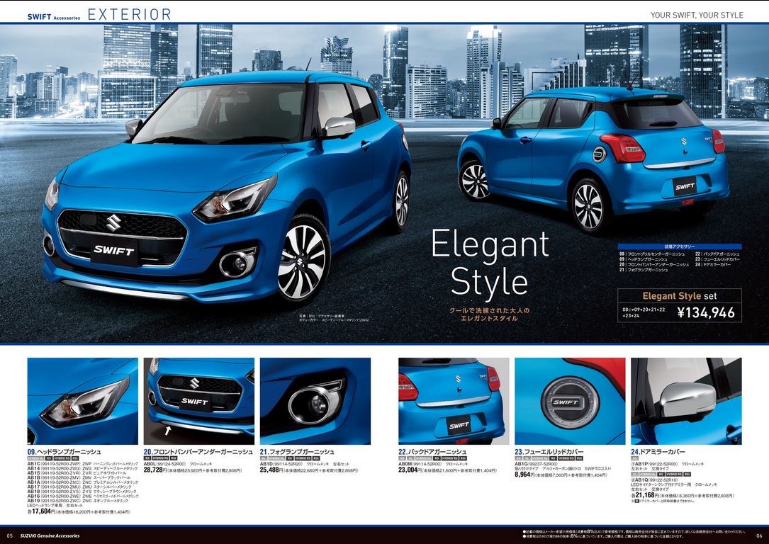 Should you chose your new Swift to look more elegant than stock, there’s the Elegant Style pack. It’ll set you back by nearly INR 8,000 (JPY 1,34,946), and get you aesthetic upgrades like chrome appliqués on the front bumper, chrome fog lamp housing surrounds, a chromed tailgate appliqué and a stylish fuel cap cover.