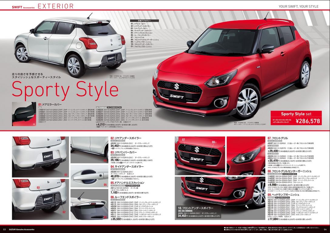 Should you chose your new Swift to look sportier than stock, there’s the Sporty Style pack. It’ll set you back by nearly INR 17,000 (JPY 2,86,578), and get you aesthetic upgrades like a front lip spoiler, black door mirror caps, body colored strip on the radiator grille, door handle cover, rear spoiler and more.
